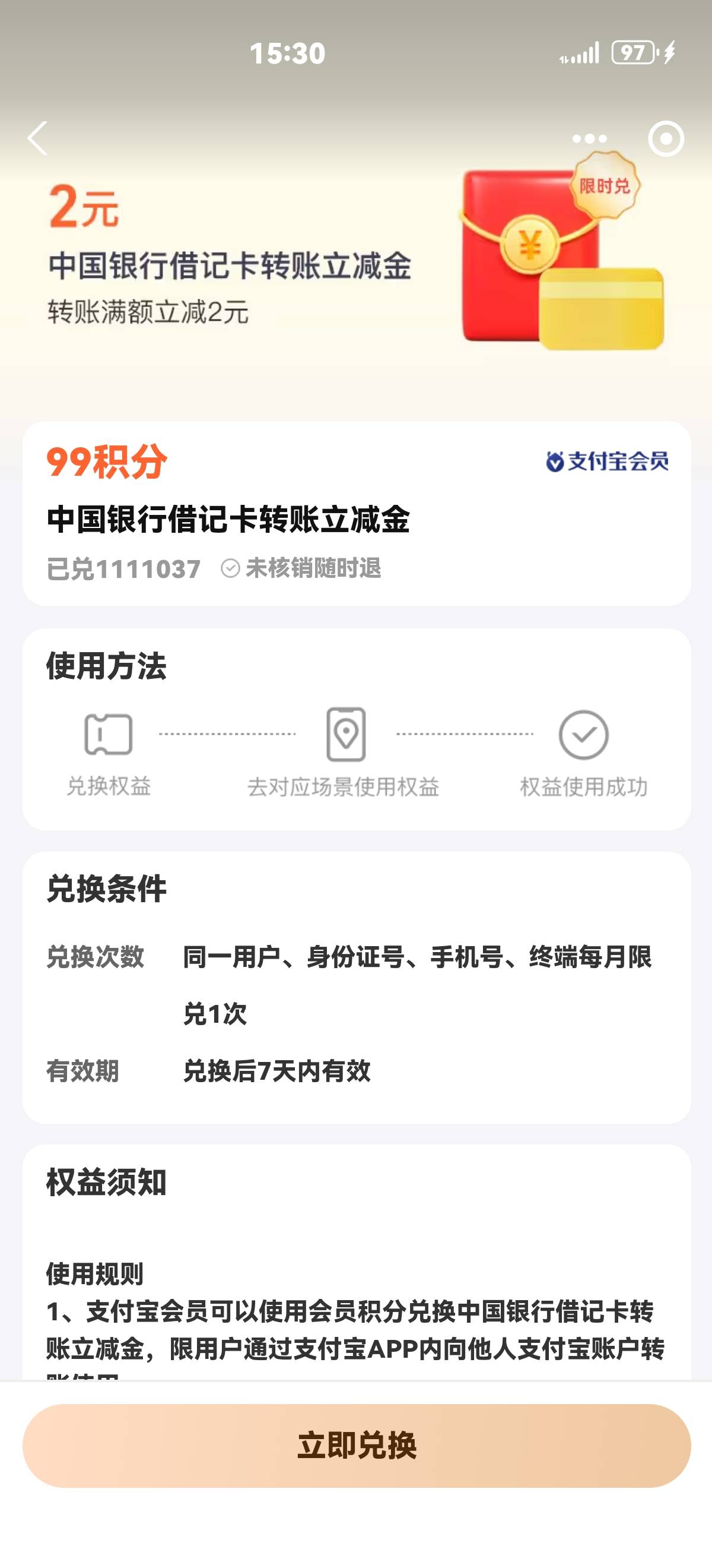 中国银行借记卡支付宝99积分换2元转账红包