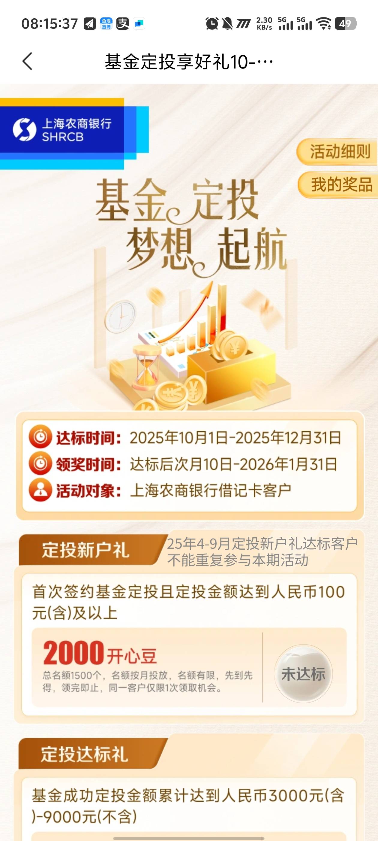上海农商有个基金定投100,下个月10号领2千豆子