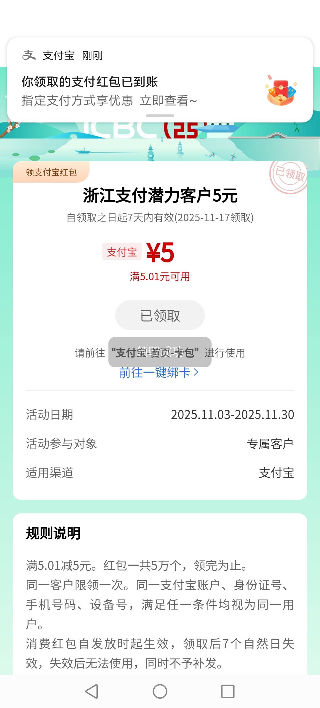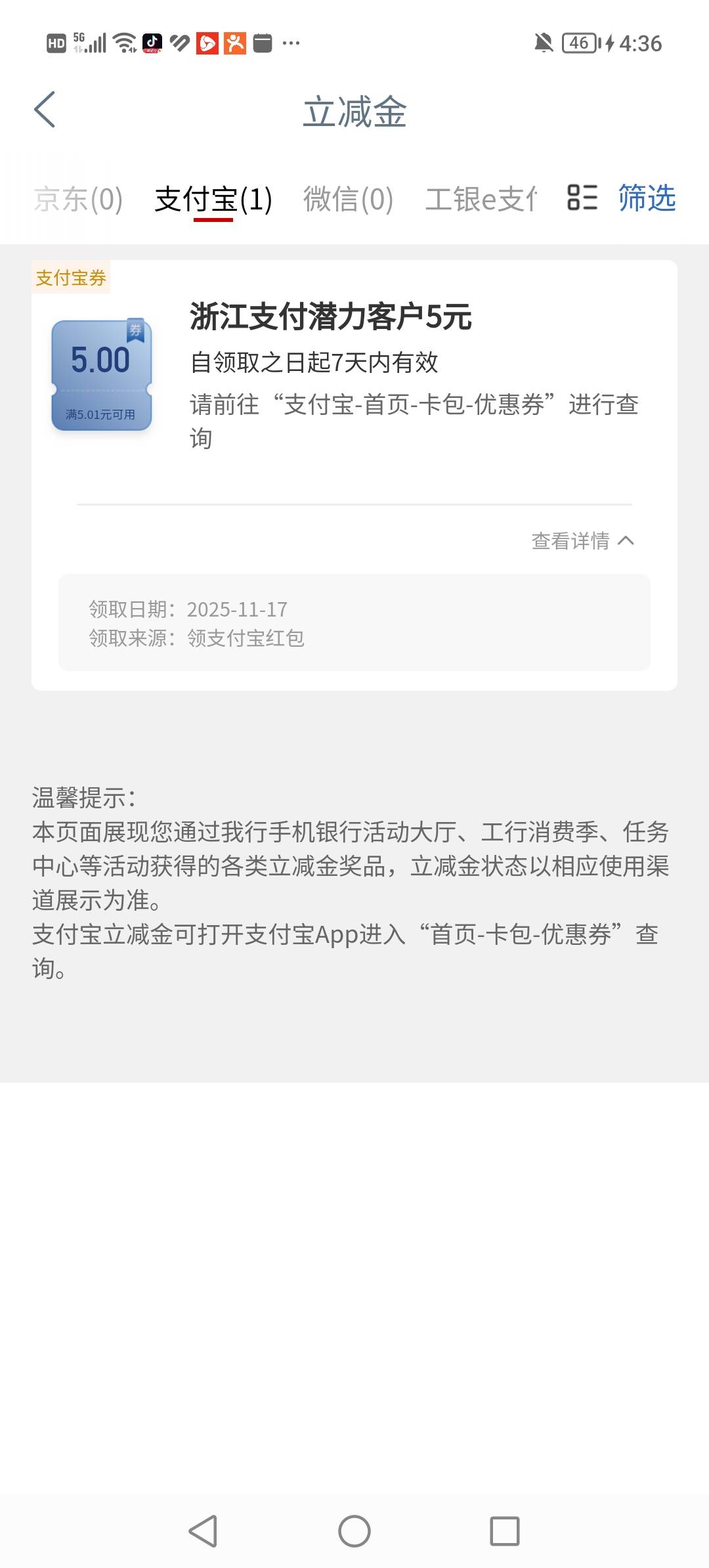 工行app进入首页,弹窗,支付宝立减金,不知道是不是每人都有。