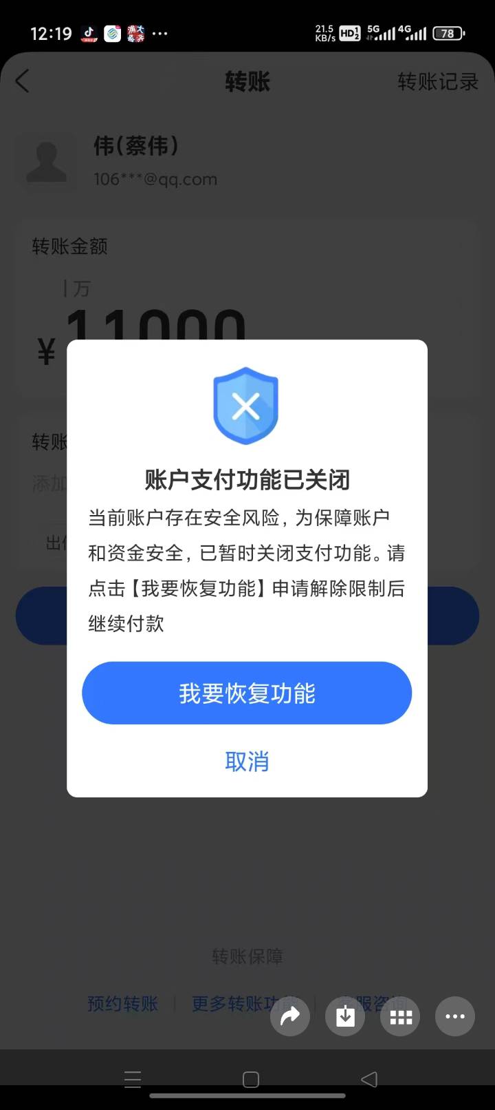 收了几笔款,支付宝提示支付功能关闭,限制支出提现,怎样才能解除限制,有经历过的老铁吗?