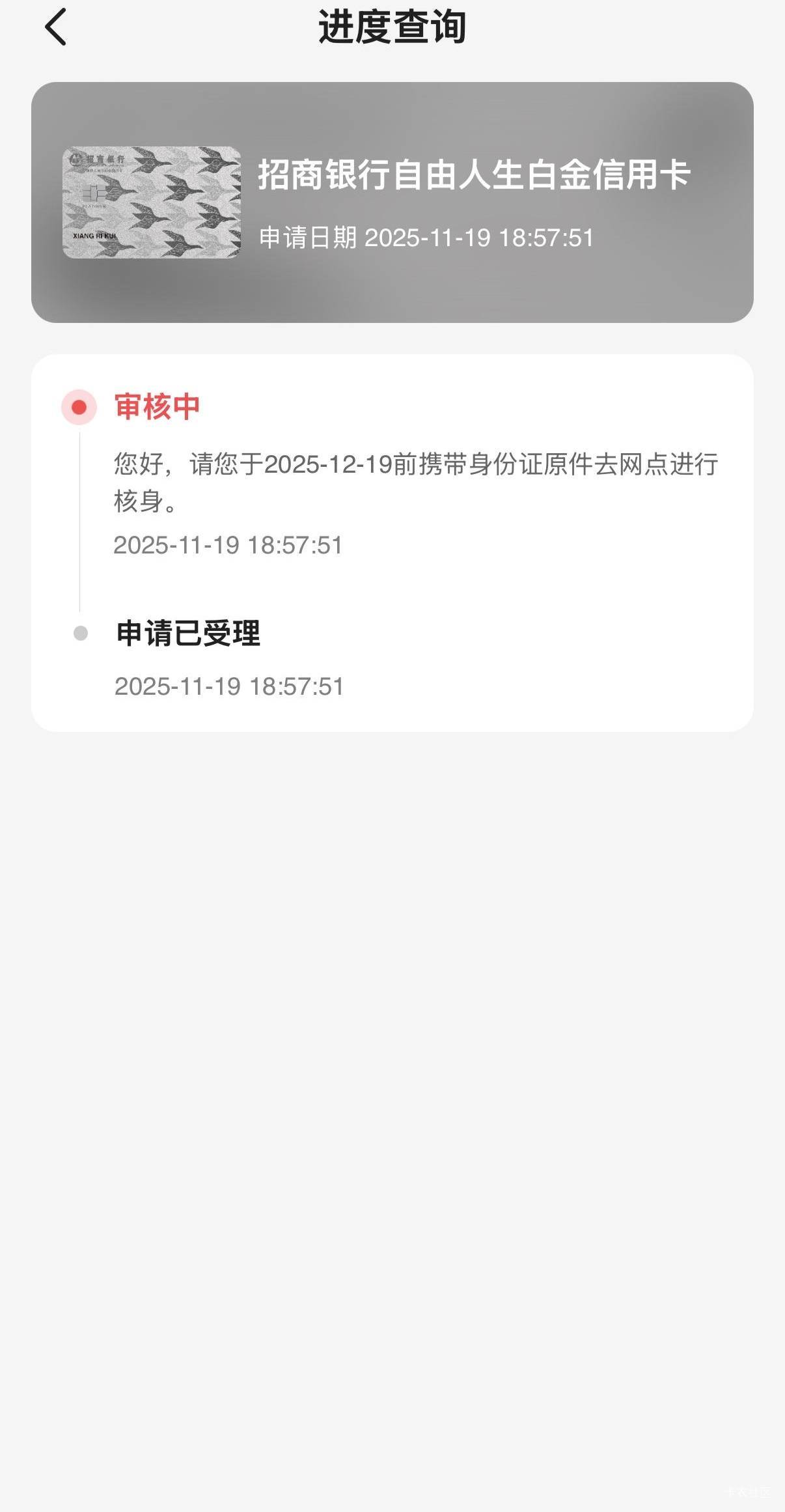 招商银行下卡了,招行首卡,审核了一天,然后让去网点核身,额度10w。