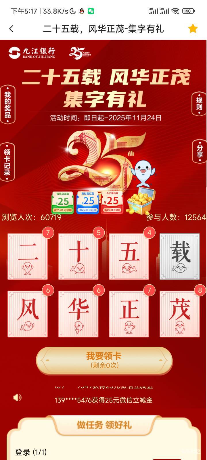 九江银行有没有老哥送个载字抽不到
