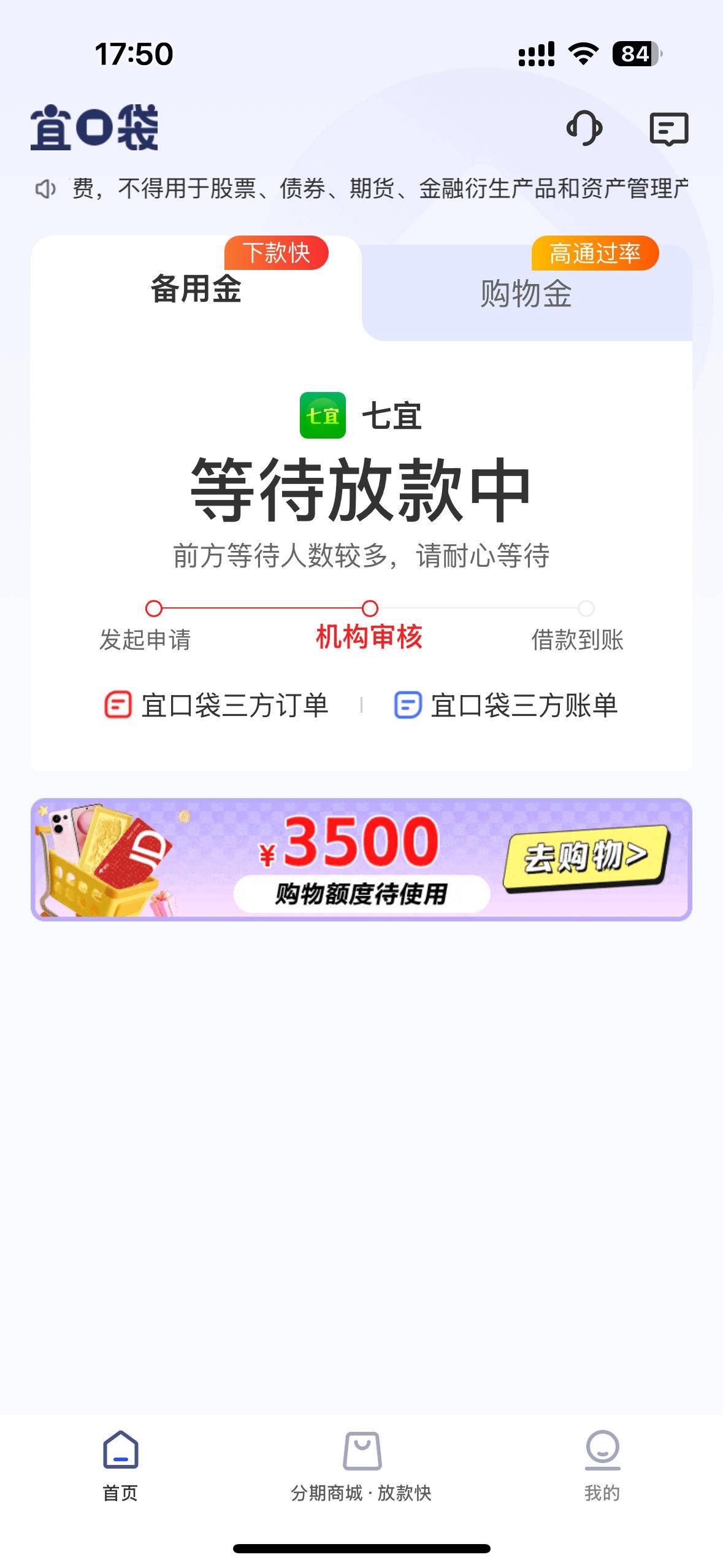 宜口袋下款4000,七宜提供只能分三期,审核差不多67分钟,但没有匹配出葡享卡,下完刷新页面也没有橙心袋,月底还款还有6000的缺口,不知明天会不会有葡享卡,再下个两笔就成。
