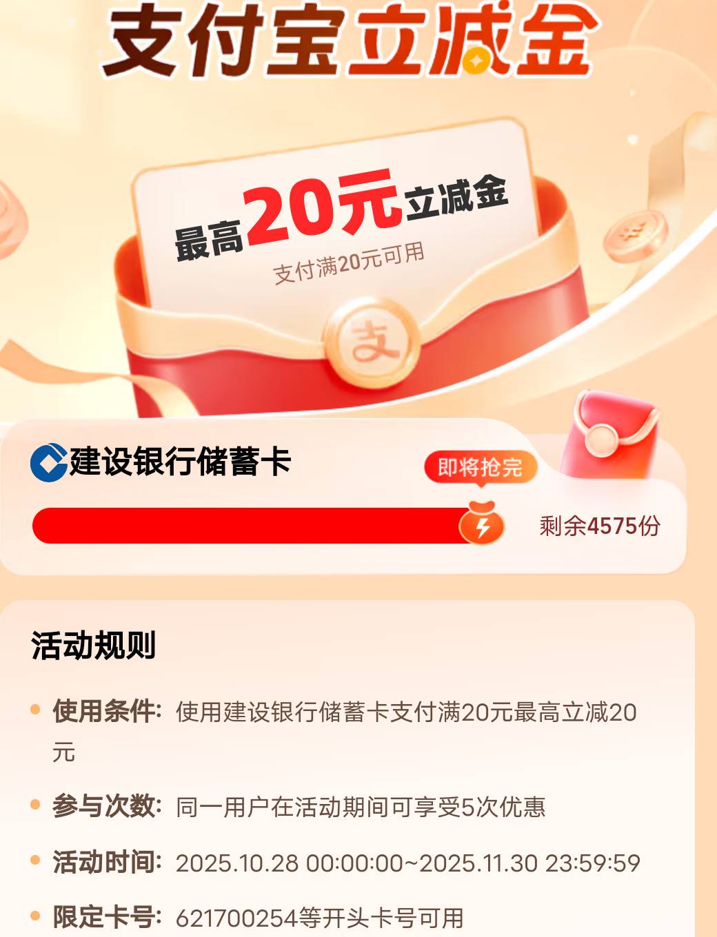 建设卡号621700254开头绑定支付宝有20