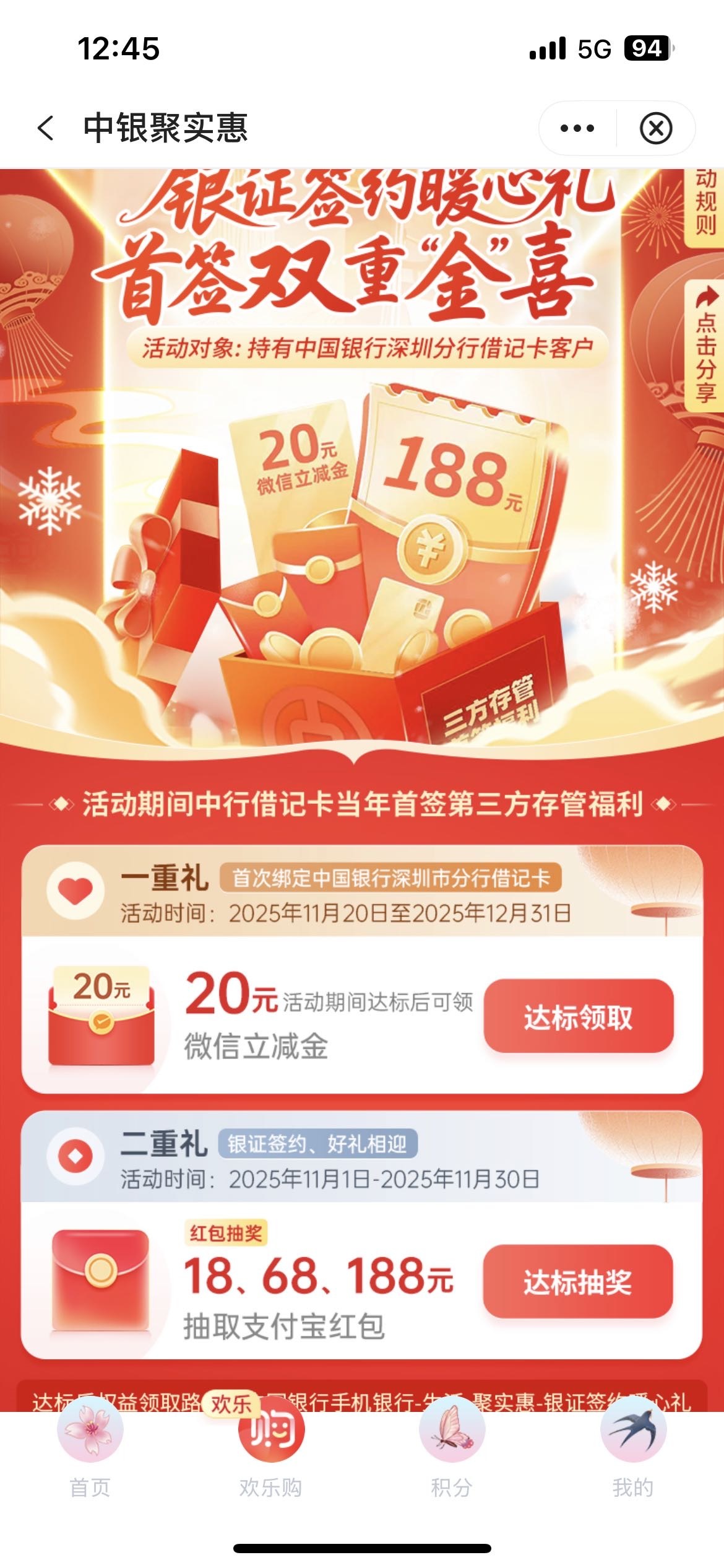 中行深圳三方存管不知道是不是更新了,之前领过一次,前两天看到日期是11.20开始的,