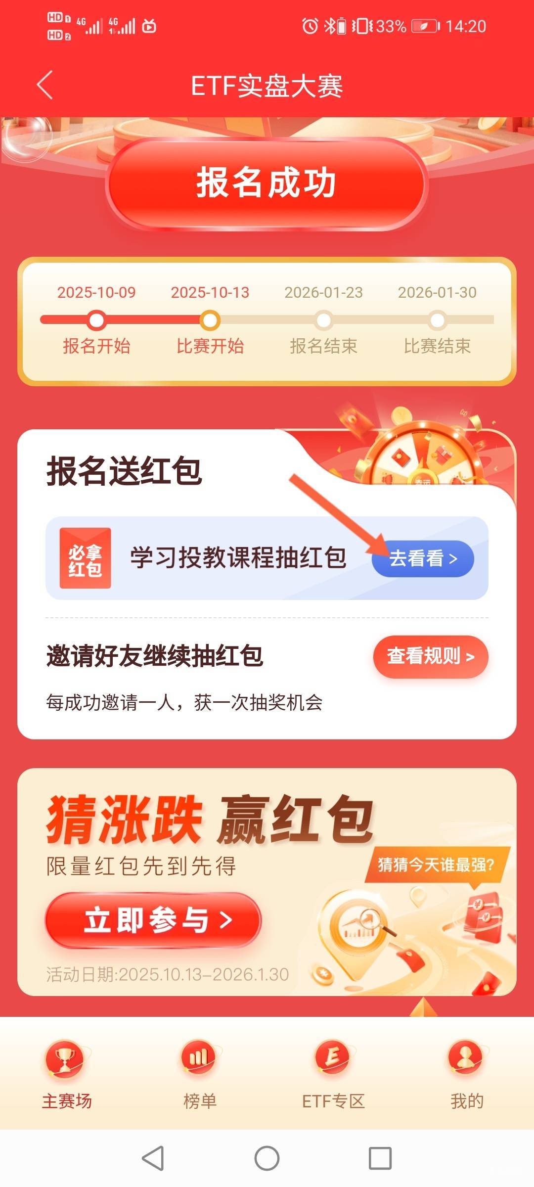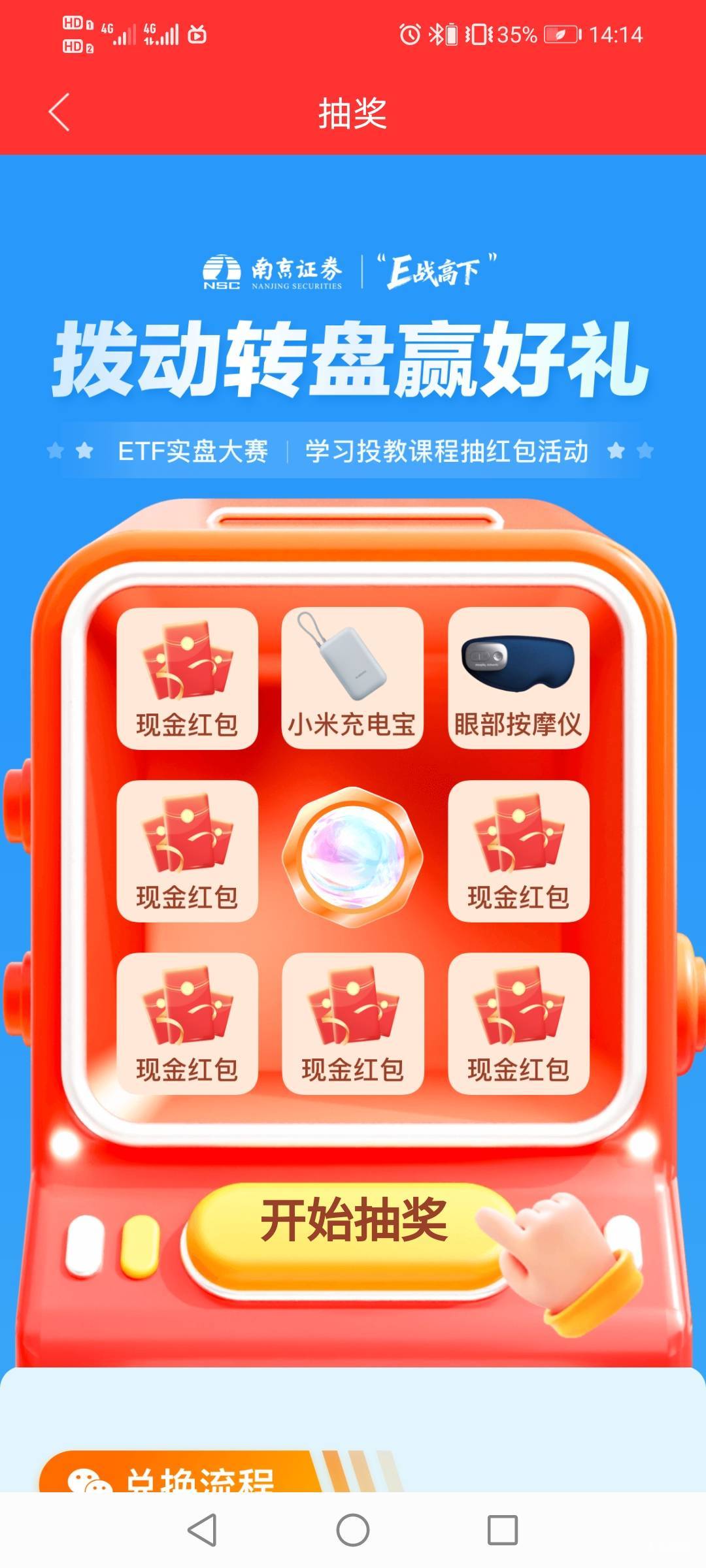 小毛,有南京证券的,下载南京证券金罗盘,首页ETF实盘大赛,报名后点下学.投教课程,不用学.直接最下面抽奖。邀请报名可加抽奖次数。还有猜涨跌有耐心的也可以玩玩,交易日前一百名猜对的可以得抽奖次数。
