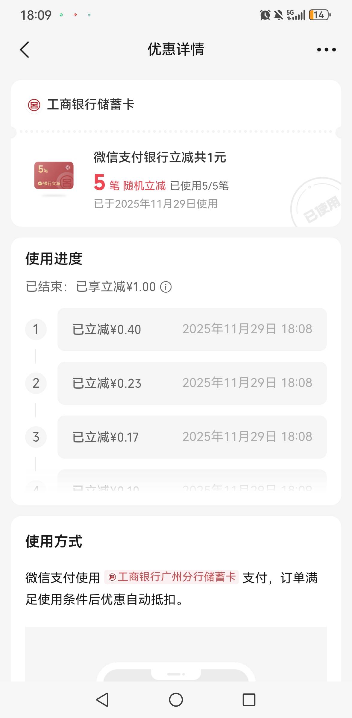 工商银行广州分行微信支付5笔共计250立减1元