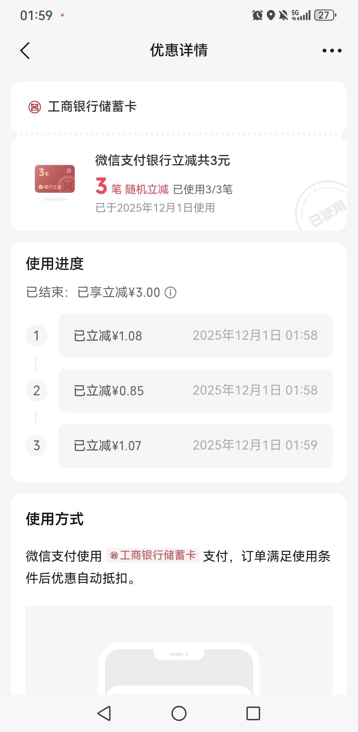 工商银行总行微信支付3笔共计600元立减共3元