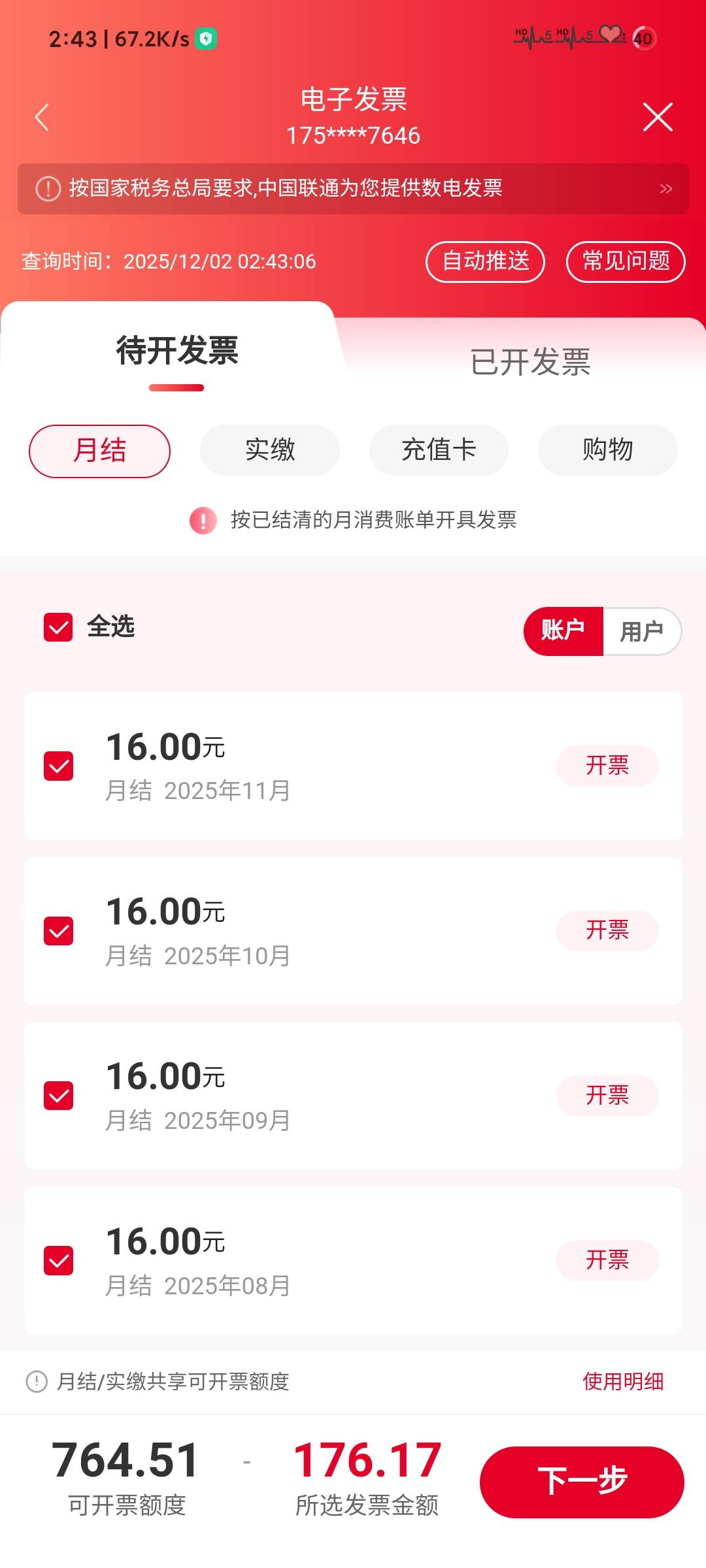 发票没看懂怎么玩,有两个东莞联通号,一年账单加起来也只能开一张票