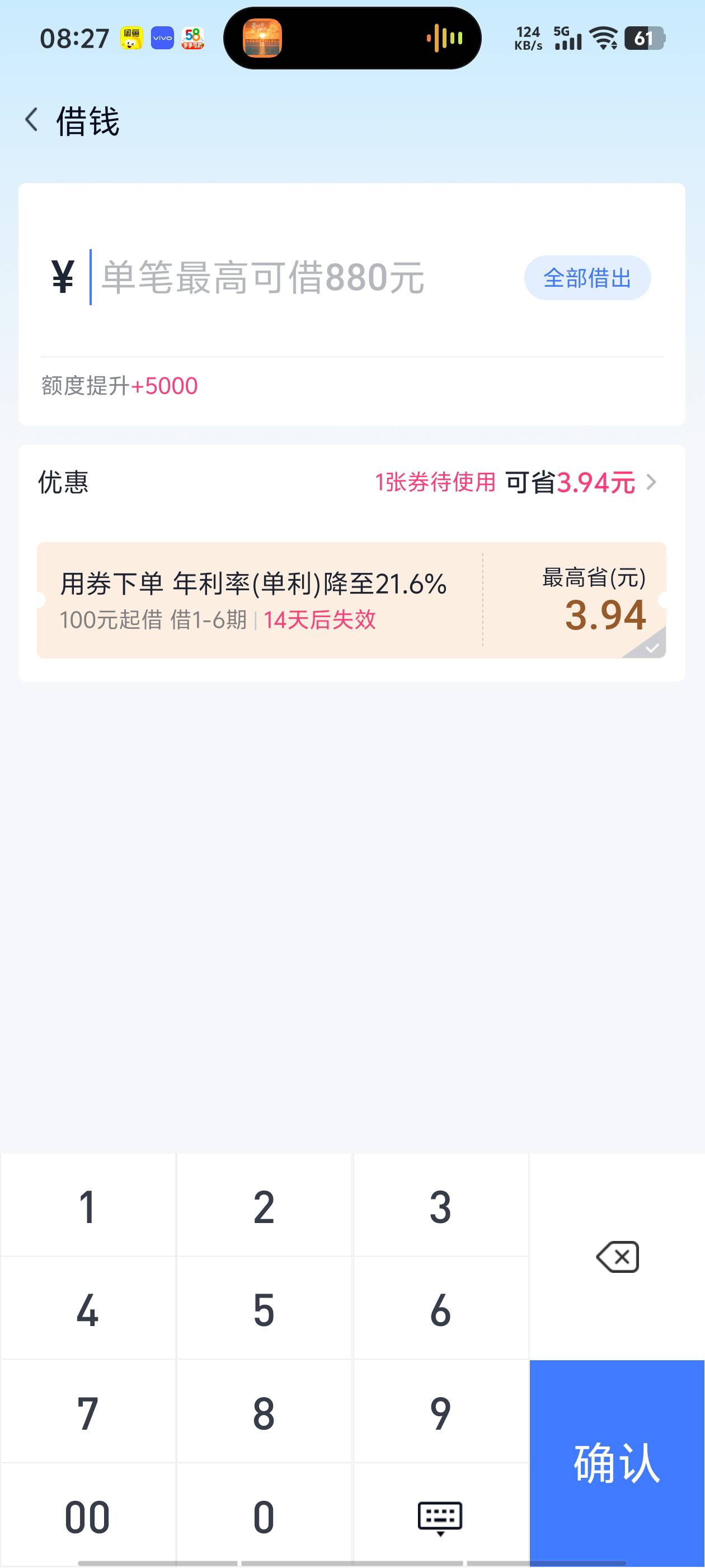 哈哈,申请半年了,终于分期乐下了,就是没明白,额度五千。怎么只能下单笔880?老哥们帮我看看什么意思。能不能借?