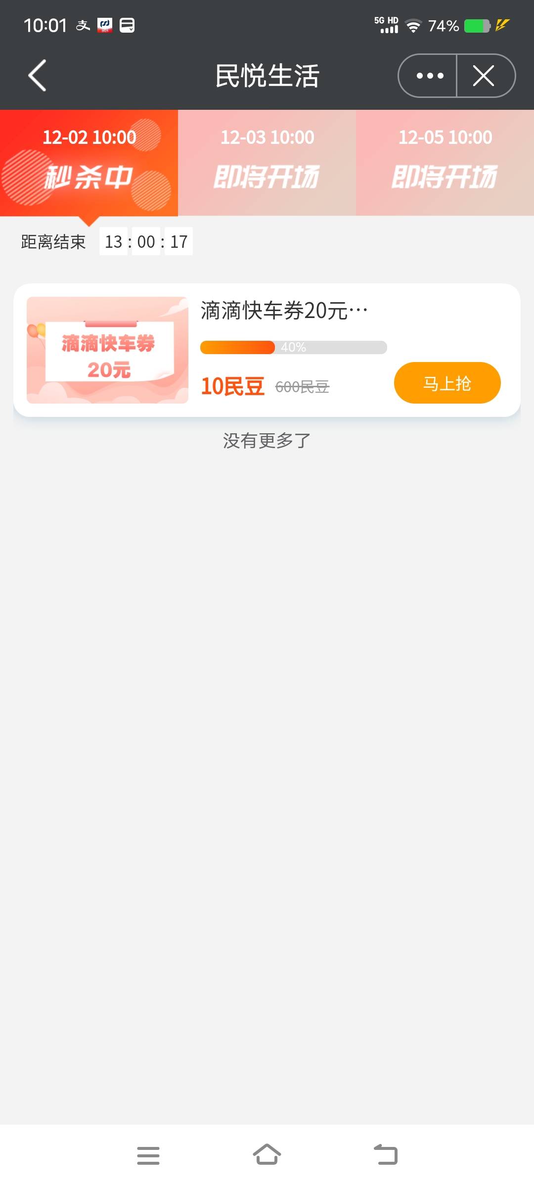 民生北京10豆秒杀20快车劵,12毛左右