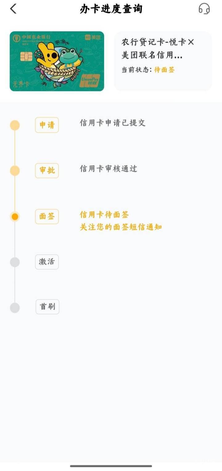 农行下卡了,几年前有个2W的悠然白,一直没提升额度,消掉了。之后一直申一直秒拒。今天见好几个帖子都在发美团卡。就填资料冲了。点提交后短信就来了。额度5W。