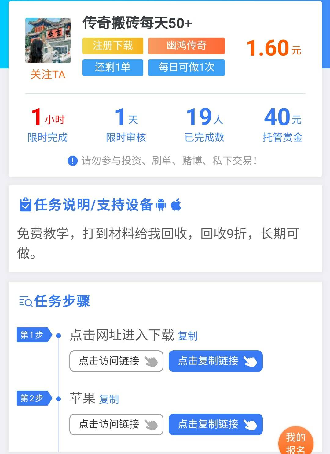 All起飞 发表于 2025-12-03 22:42 任务台就有。但再怎么搬砖也要有前期投入。他们都说可以0投入,但你试了就知道0投入你连个毛都看不见