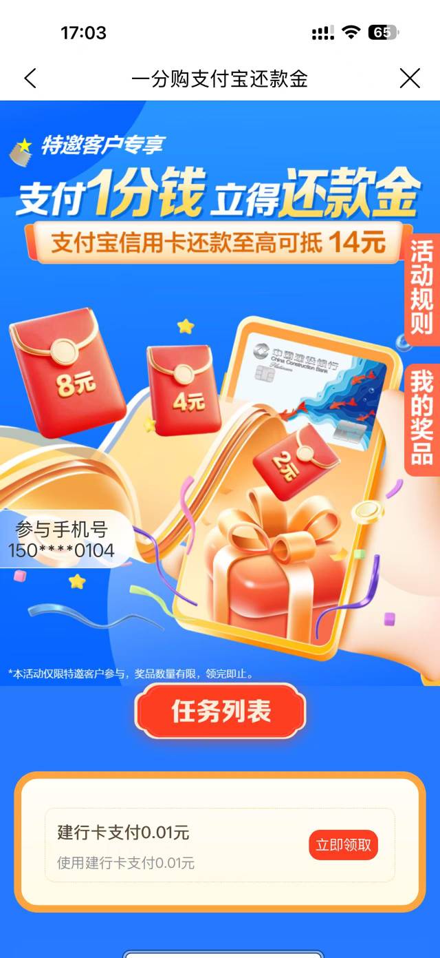建行特邀客户专享支付1分钱立得还款金活动