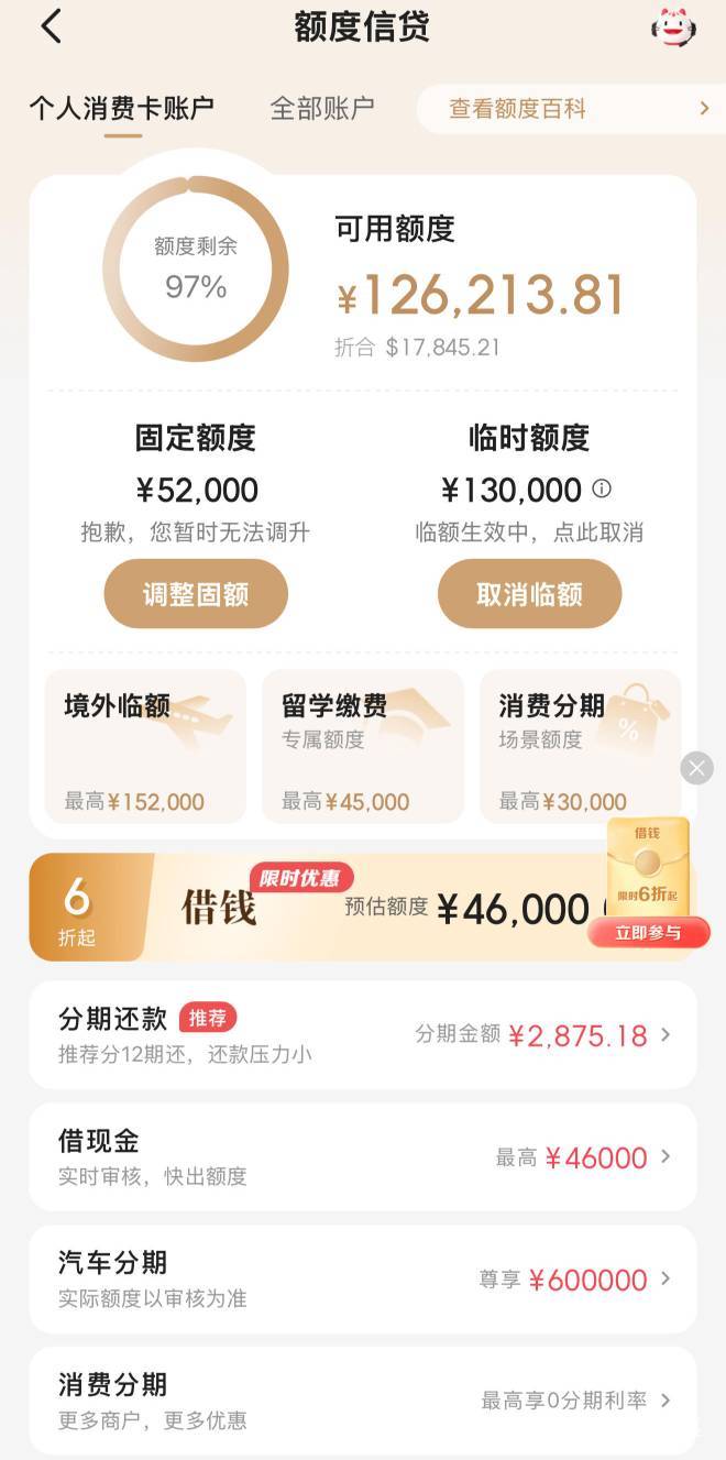 招商银行上个月临时额度97000,今天又给到130000,什么时候能提固额?什么时候能收到