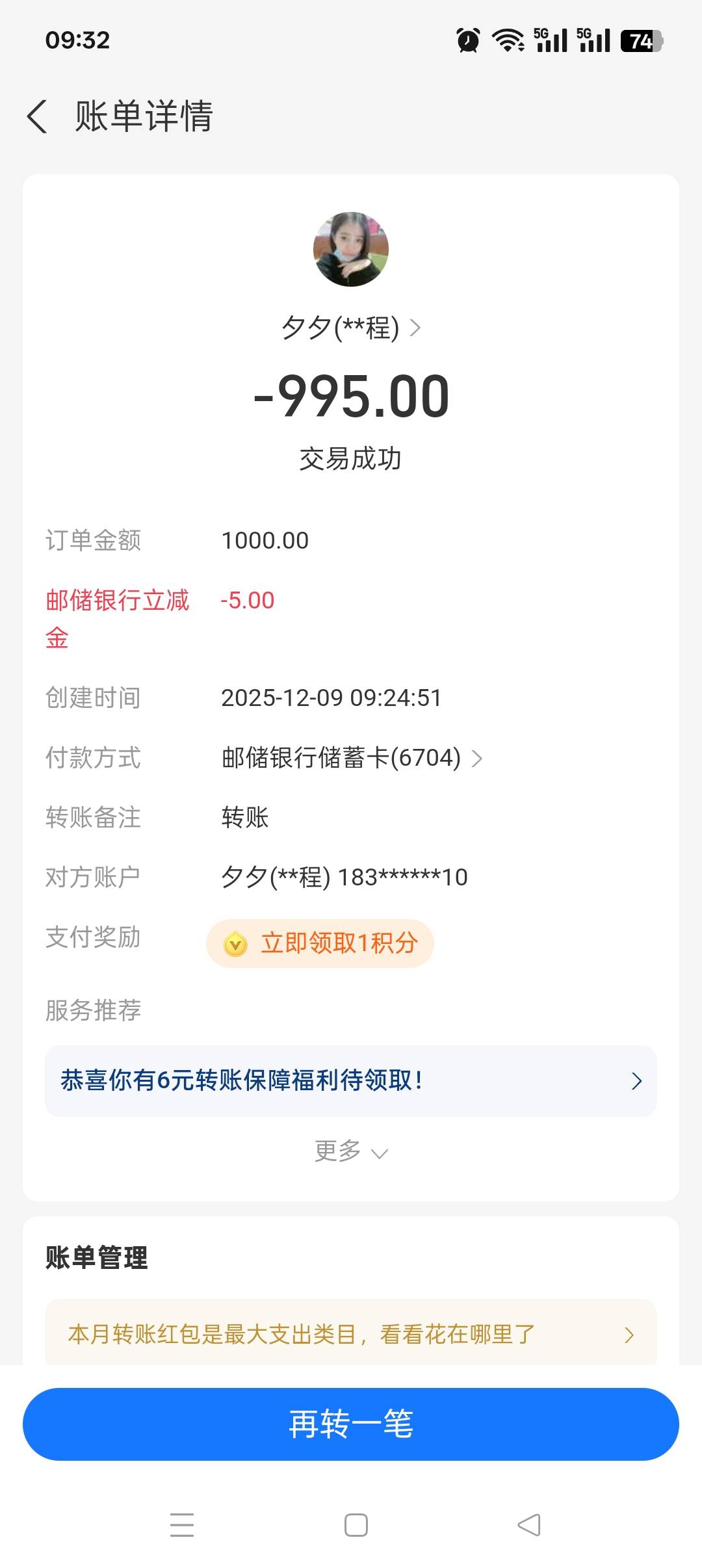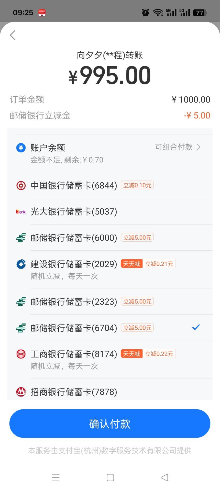 zfb邮储,直接转1000-5两次,我几个不同地区的k都有-5,转账,不是収歀那个,我的三个