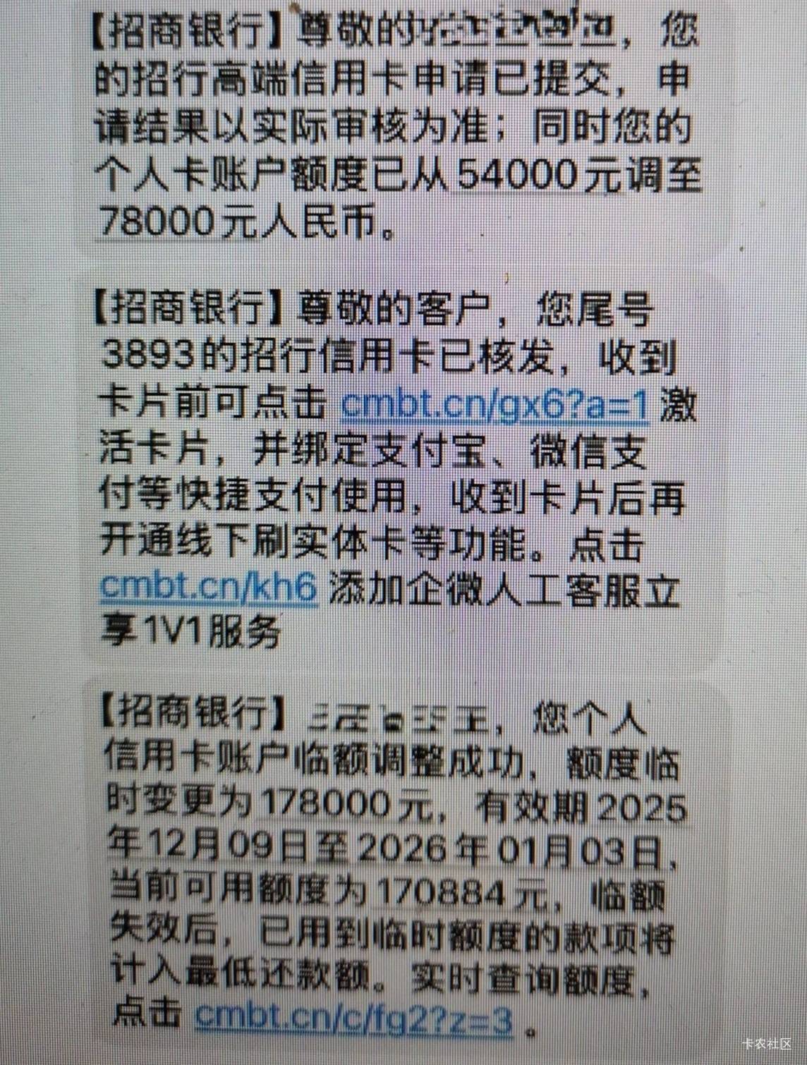 招商银行鸟白下卡了,感谢这个论坛让我学习了很多,要知道,以前不懂信用的底层逻辑,让我一直在网贷的高额利息中打转,知道我的人可以看下我历史帖!招商卡我用了20多年,才5w4的额度,自从在论坛学到了点东西,现在突破了这个瓶颈,今天招行给我开了鸟白,我已申请下来了,下一步,把那些菜卡全注销掉,只申领好的信用卡,大家帮我推荐下申领哪个比较好,我现在还有民生一张广发一张准备全关了。