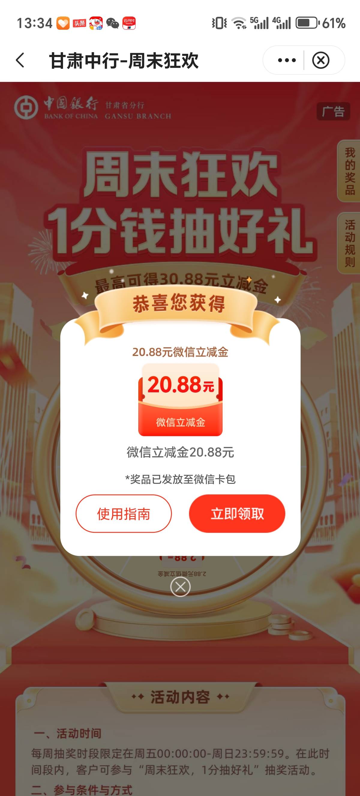中行甘肃周末狂欢1分钱抽好礼活动