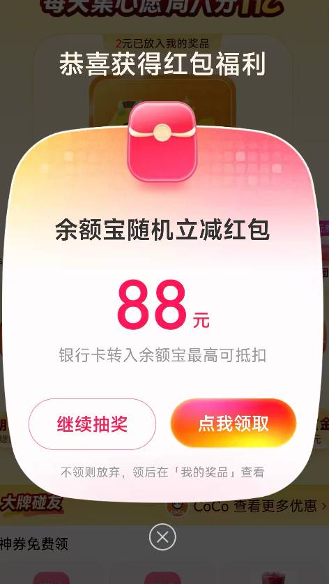 支付宝支付有礼余额宝随机立减88元红包活动