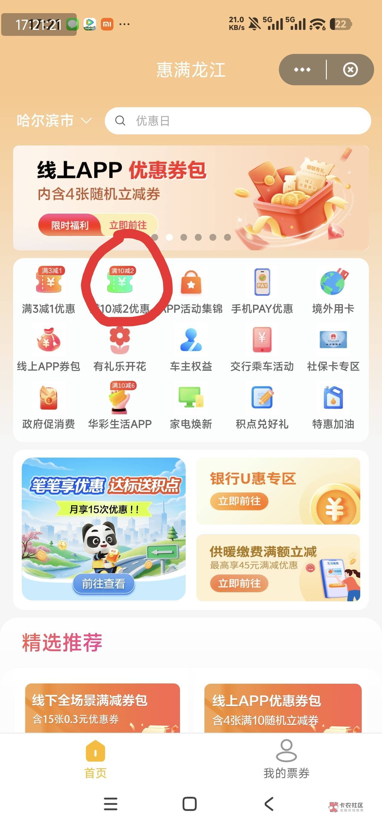 少妇黑龙江,惠满龙江里面可以领10-2线上消费券,各个银行一共可以领三十多张,可以买携程10元出,京东携程10元加上一个0.01的权益一共10.26,付8.26可以9.89出,一张1.63润,大部分银行二类都可以用,每个应用可以领2张,一天可以使用一张