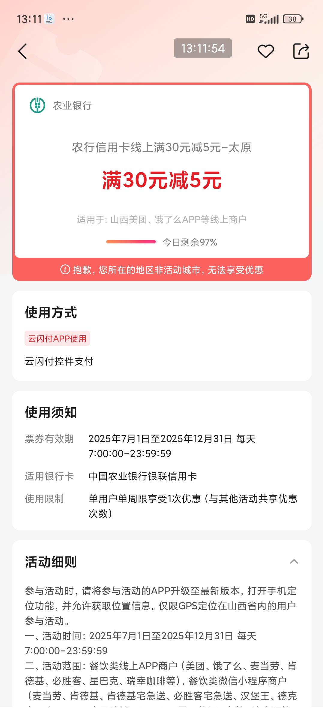 山西农行信用卡美团30-5买团购应该可以无损