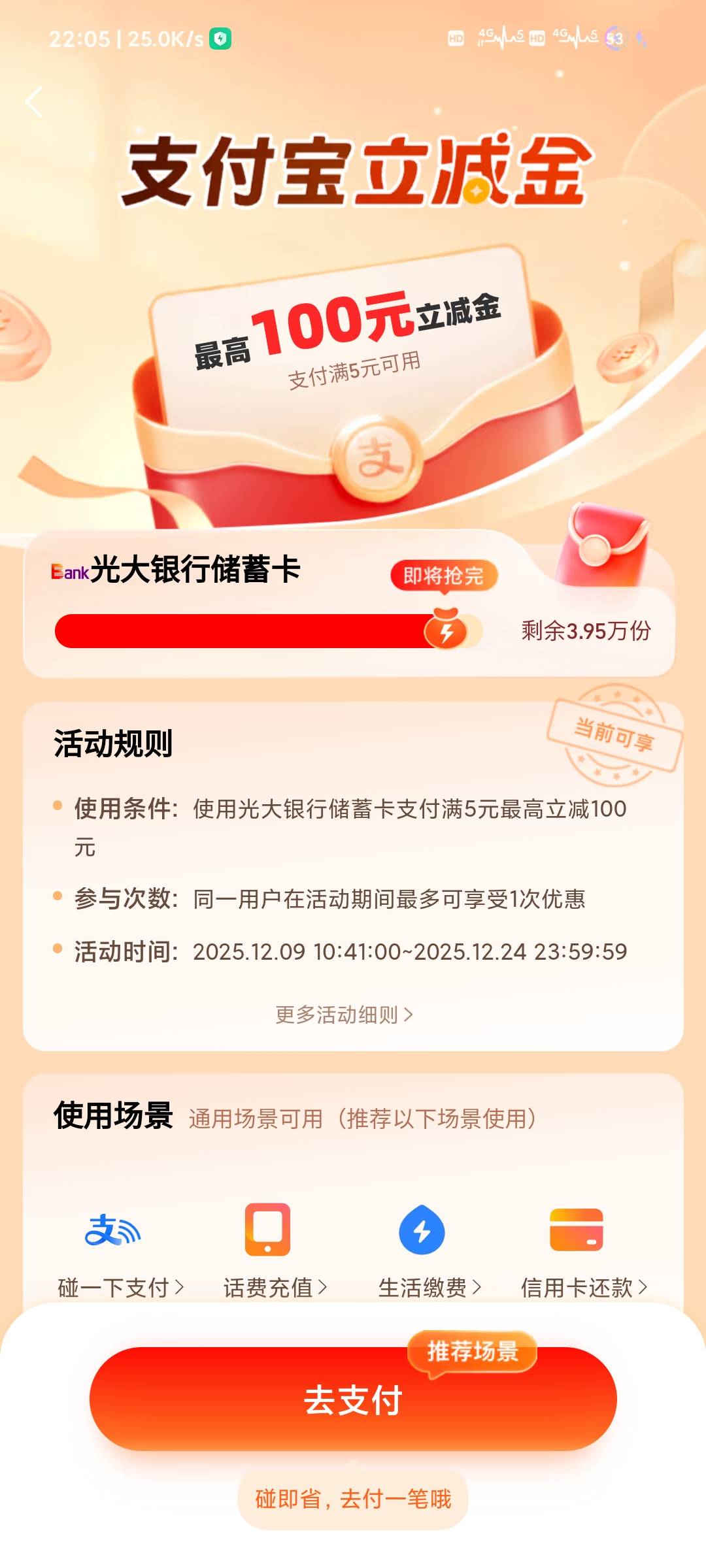 勾槽的支付宝,老哥们前两年刷最高立减优惠基本上人人都刷出来过大包,然后上一年暗改后就没见过有老哥发帖刷出来大包了,除了那些固定的立减,这些最高减66,88,100的真就成摆设了,只能刷出来最低那一档,刷到活动结束都刷不出来大包