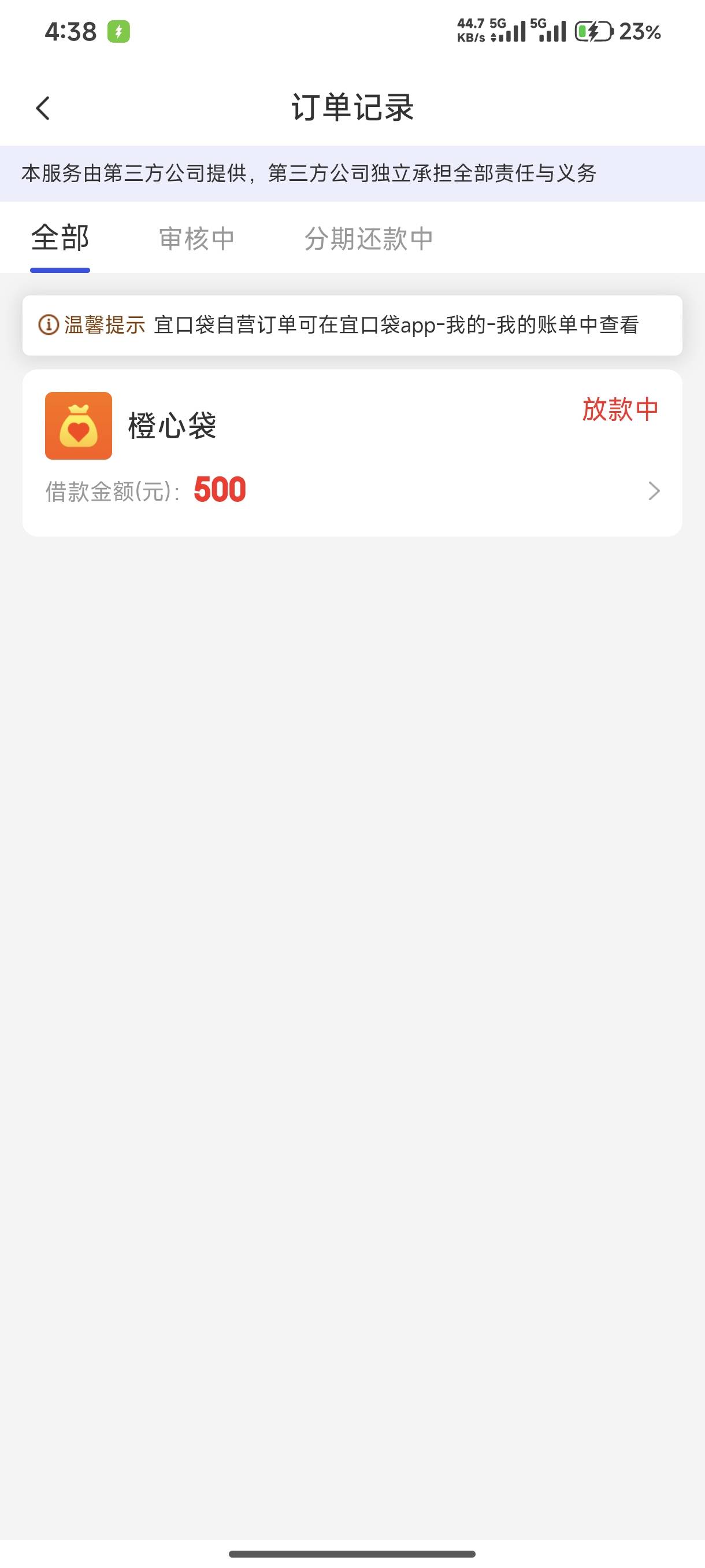 第一次出橙心袋,宜口袋没有逾期。开会员借4000,变成放款500了,放了一天没动静。