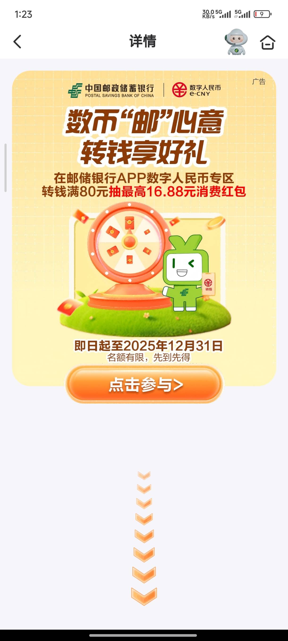 邮储银行数币邮心意转钱享好礼活动