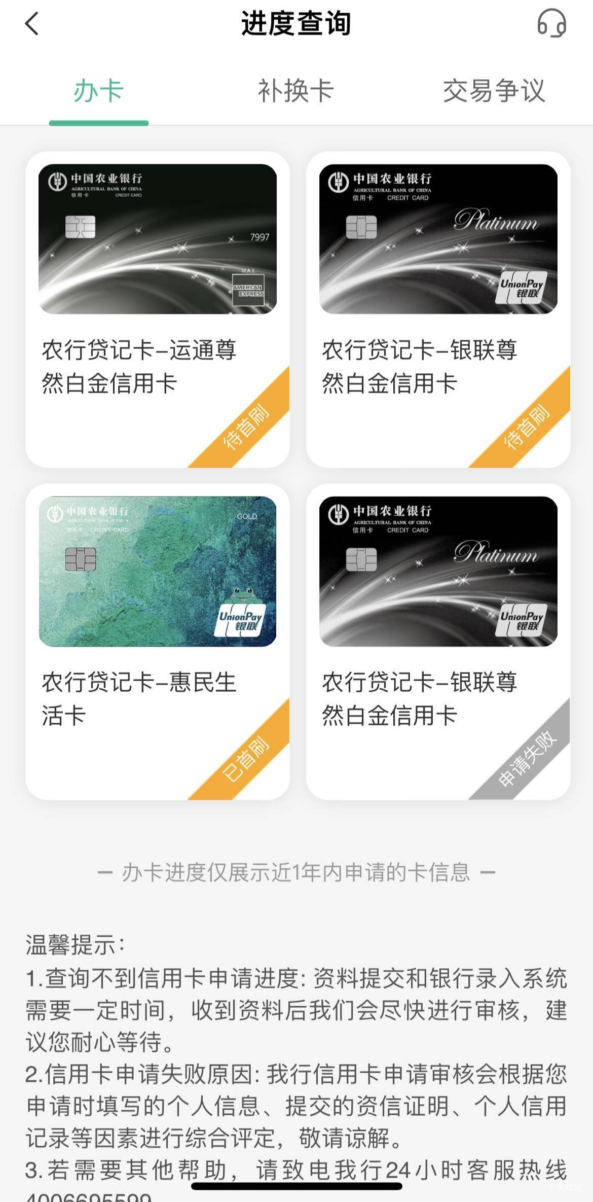 农行下卡了,事情是这样的,十多年都没有和农行打过交道。11月28日上午我去农行办一张一类储蓄卡,大堂经理问了一下我办卡干嘛用,哪个工作单位,因为工作人员知道我的工作单位,然后就没说啥,直接给我办了张储蓄卡。办完后,工作人员突然说让我帮忙他完成一张信用卡任务,说什么app上看到有办信用卡的额度,然后呢我也没多想,就由工作人员办了张惠民生活信用卡,当场秒P5w额度。中午没事的时候,我就看了一下农行白金卡,才知道有银联尊然信用卡,网上没找到申请入口,然后我下午就又跑去农行了,说了一下个人基本情况,然后工作人员说可以试试看,然后就线下进件申请了银联尊然信用卡,第四天我问工作人员怎么没审核,说待拒,补充进件,然后我又按要求进件了,然后期间又问了工作人员怎么没审核,答复分行在审核,耐心等待,一直到今天12月17日(整整20天)早上查看被拒了。我挺无语的,听说农行一个月内申请信用卡只查询一次征信,然后我不服气,今天早上找到了网上申请入口,因为有点生气被拒了,没看清楚,就申请了运通尊然信用卡,秒P通过,通过后才发现我申请错了,紧接着,我又申请了银联尊然信用卡,也是秒P通过,额度共享。那么问题来了,怎么线下审核不通过,线上申请就秒P了,实在是搞不明白。