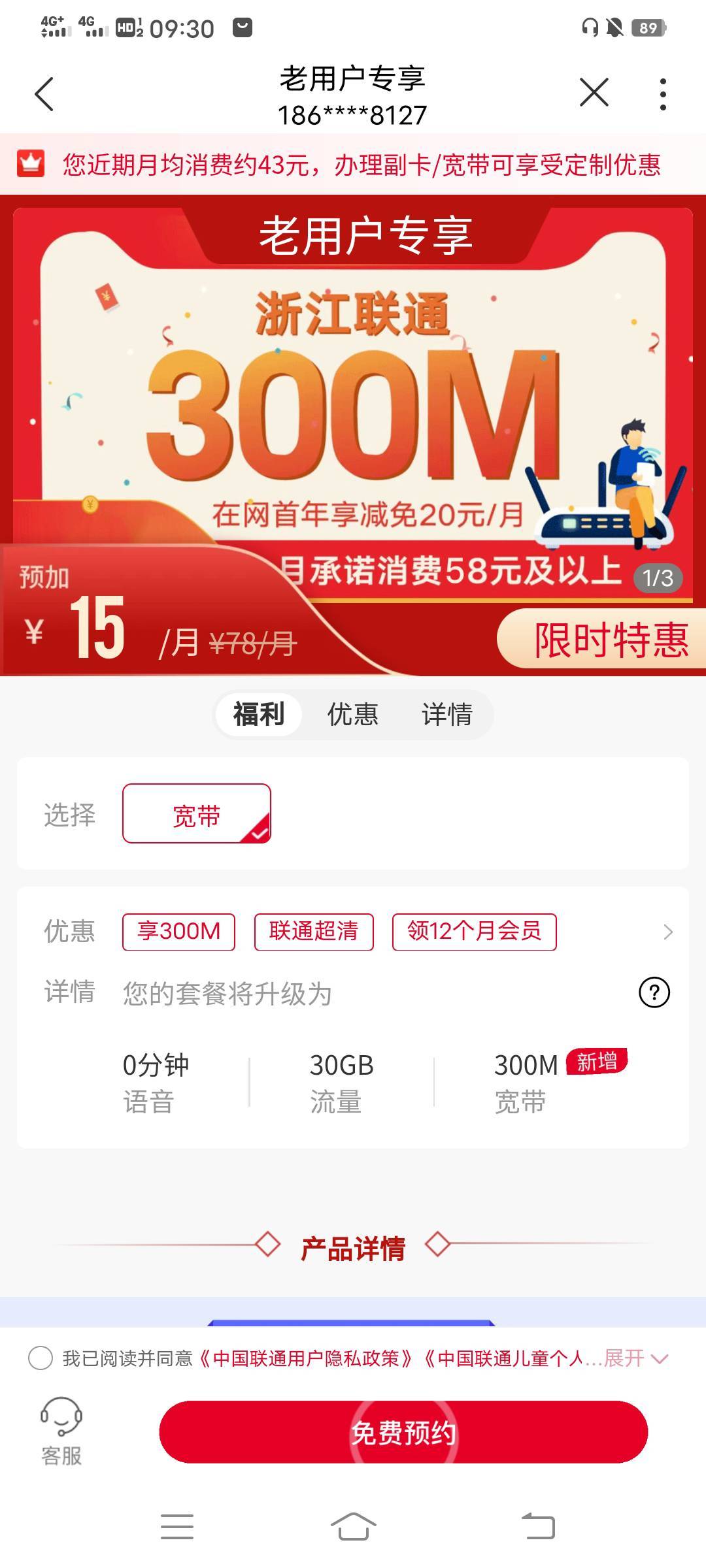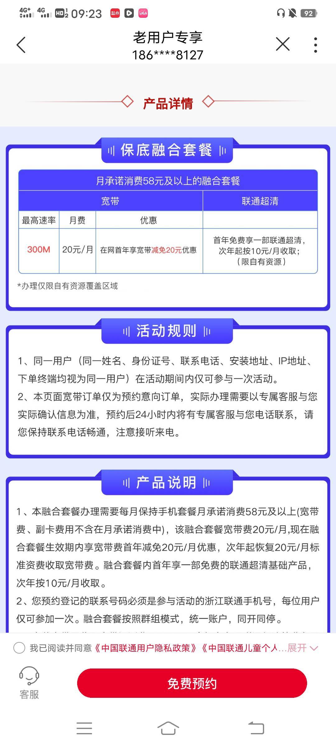 我的江苏联通,月消费18,也是再加20一个月,500M宽带