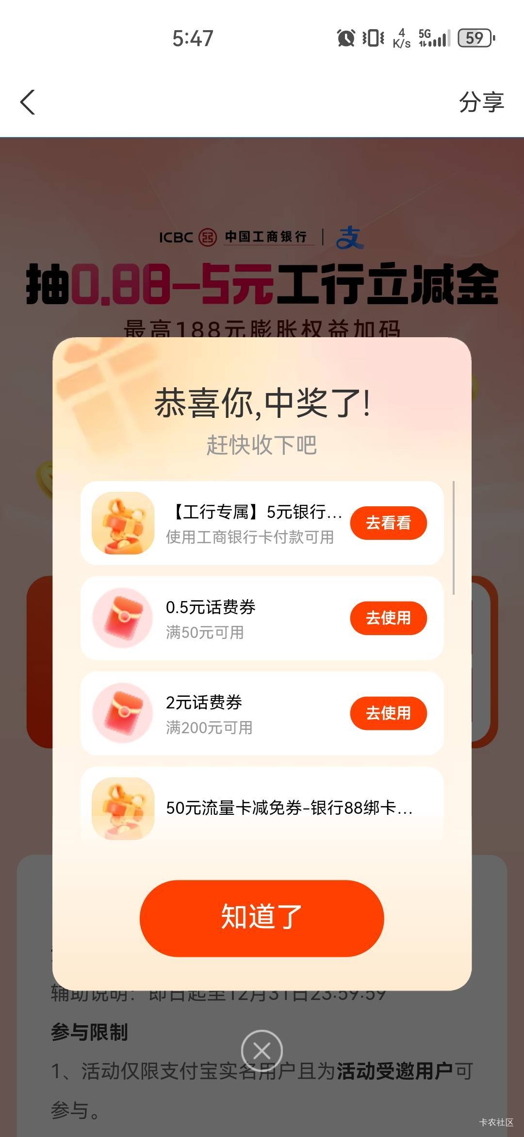 支付宝搜索支付宝立减金,中间横幅工行抽奖,我中了5,快冲