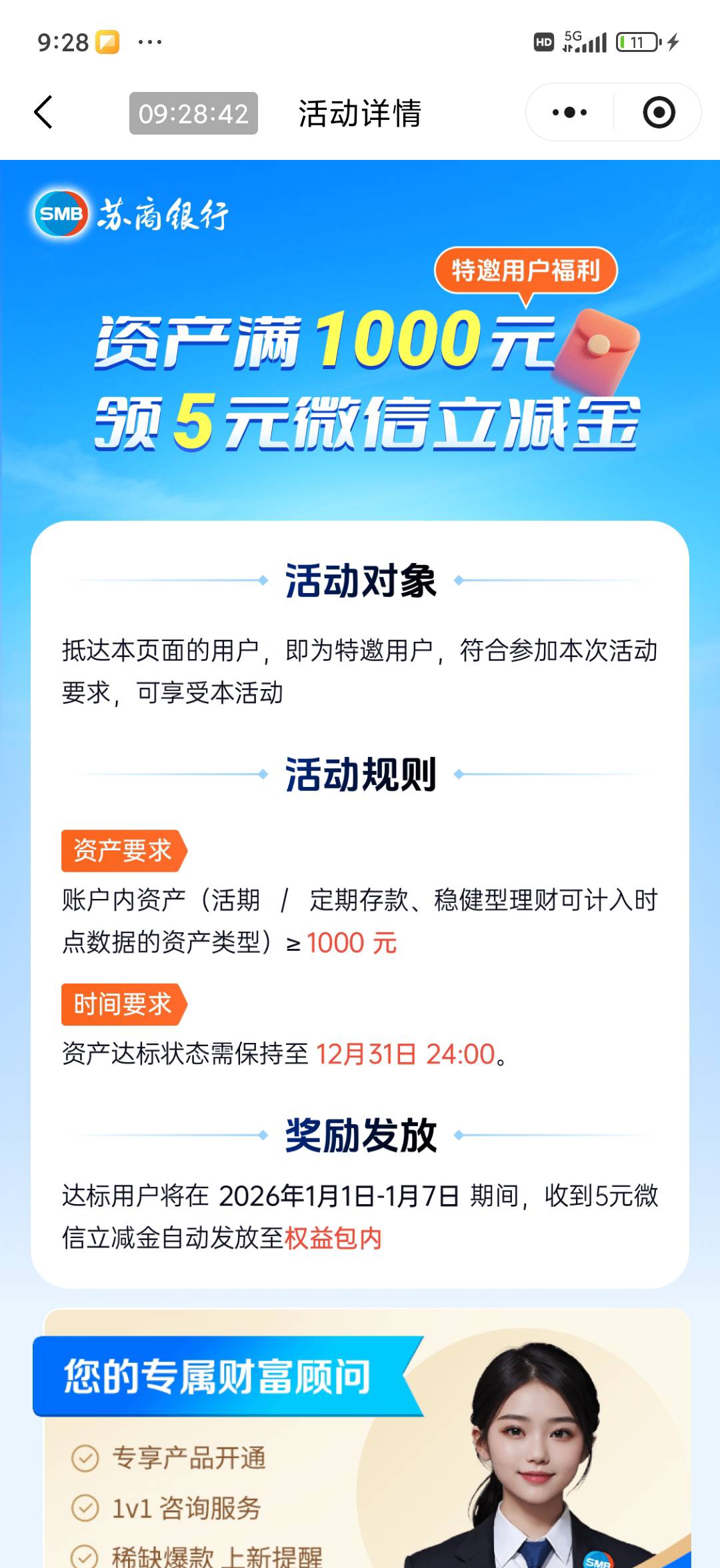 苏商银行资产满1000元领5元微信立减金活动
