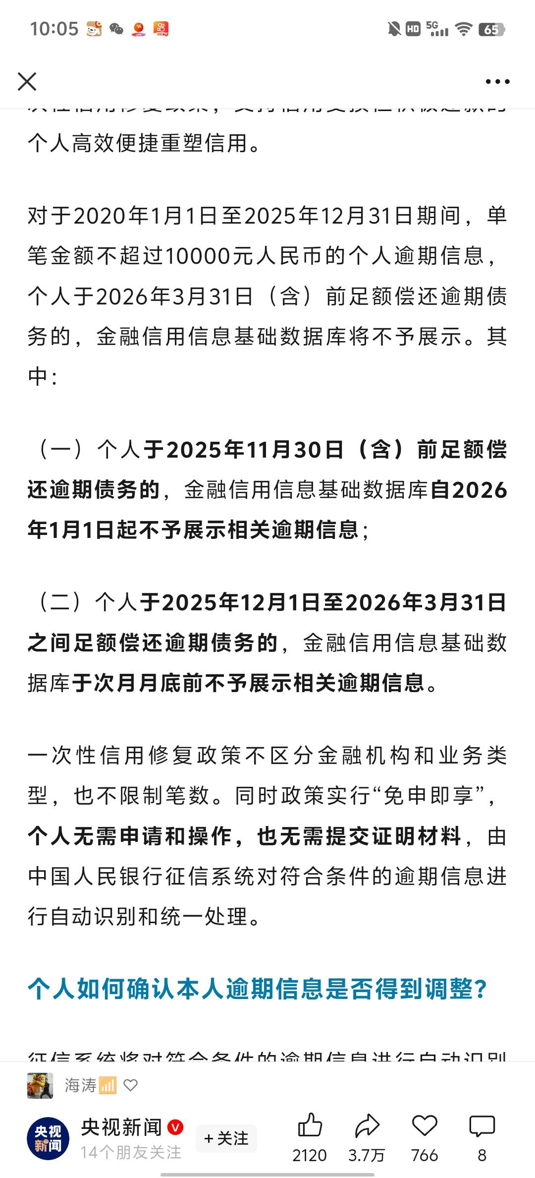 说白了了负债逾期太多人了,国家经济不行,有钱的人不贷款,逾期的人记录差的人从银行贷不了款,国家要刺激经济呀,不删除征信逾期记录,银行的钱怎么放出来,又不能改银行的贷款标准,只能在征信报告上修改呀,所以前提条件是逾期全部还款,然后控制查询6个月,应该可以正常银行贷款了