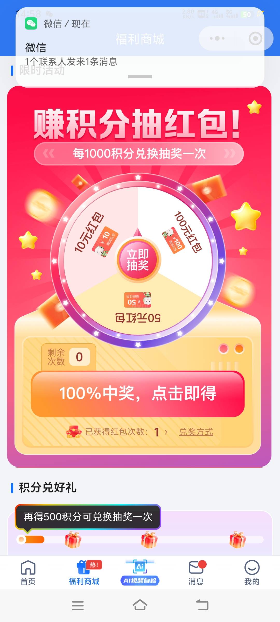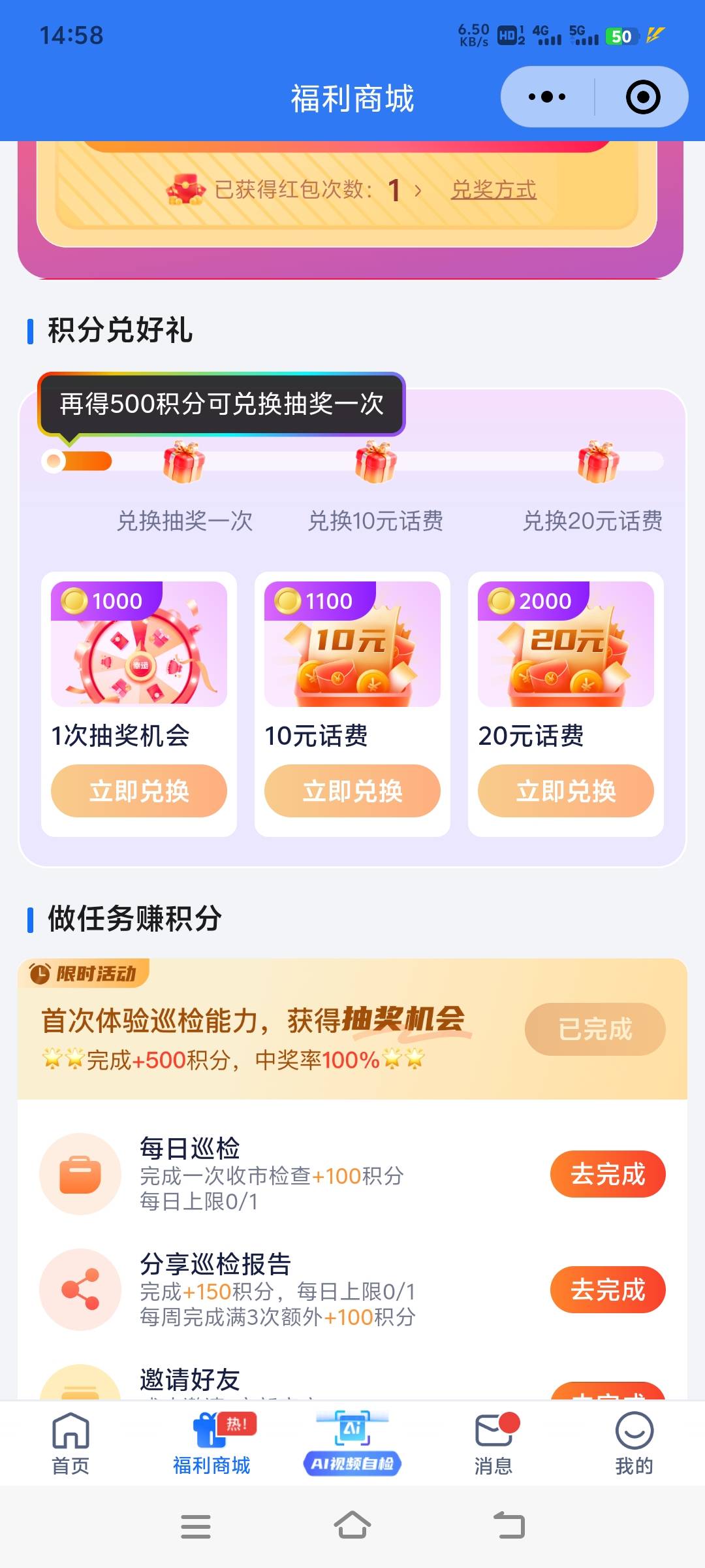 聚安卫士小程序,下面福利商城首次体验巡检能力,可以有一次抽奖机会,保底可以抽10元,最高100,随便拍个照点下合格就行,点4次合格就能抽了,抽到会让你加企微好友把中奖截图给他看就行了。