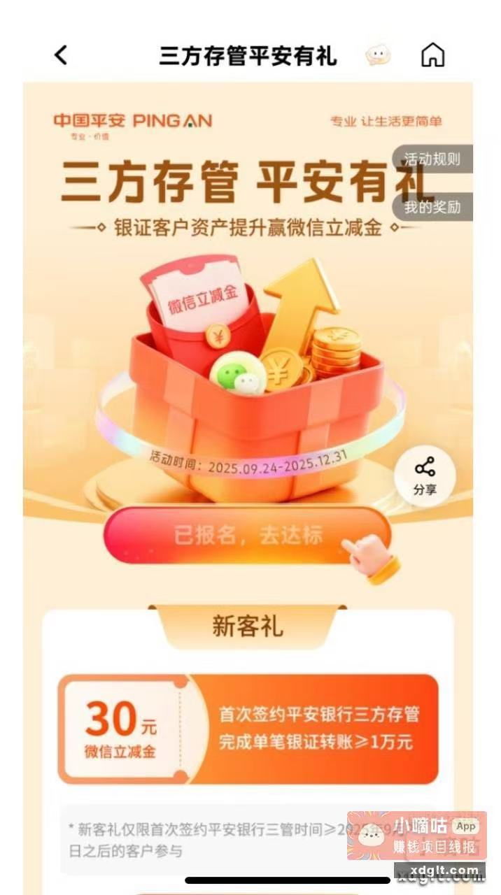 平安口袋银行搜索.三方存管平安有礼.,先在证券APP上更改存管账户为本人名下的平安cxk,已实操国信很快能改,改好后才能报名,然后转1w到证券账户,秒领30微信立减金,领完了再转出