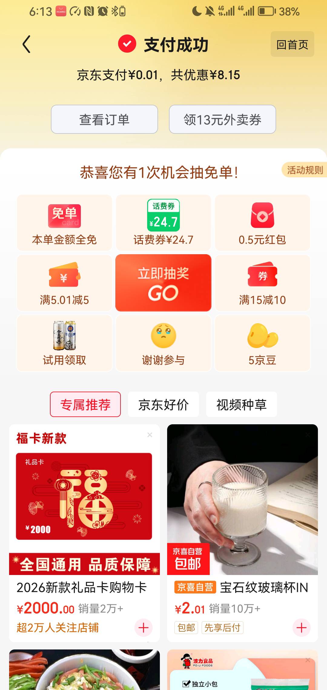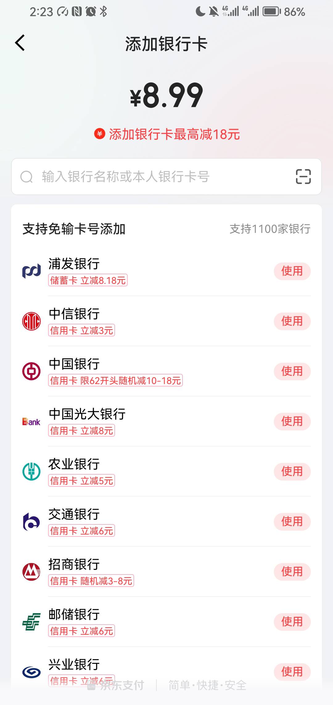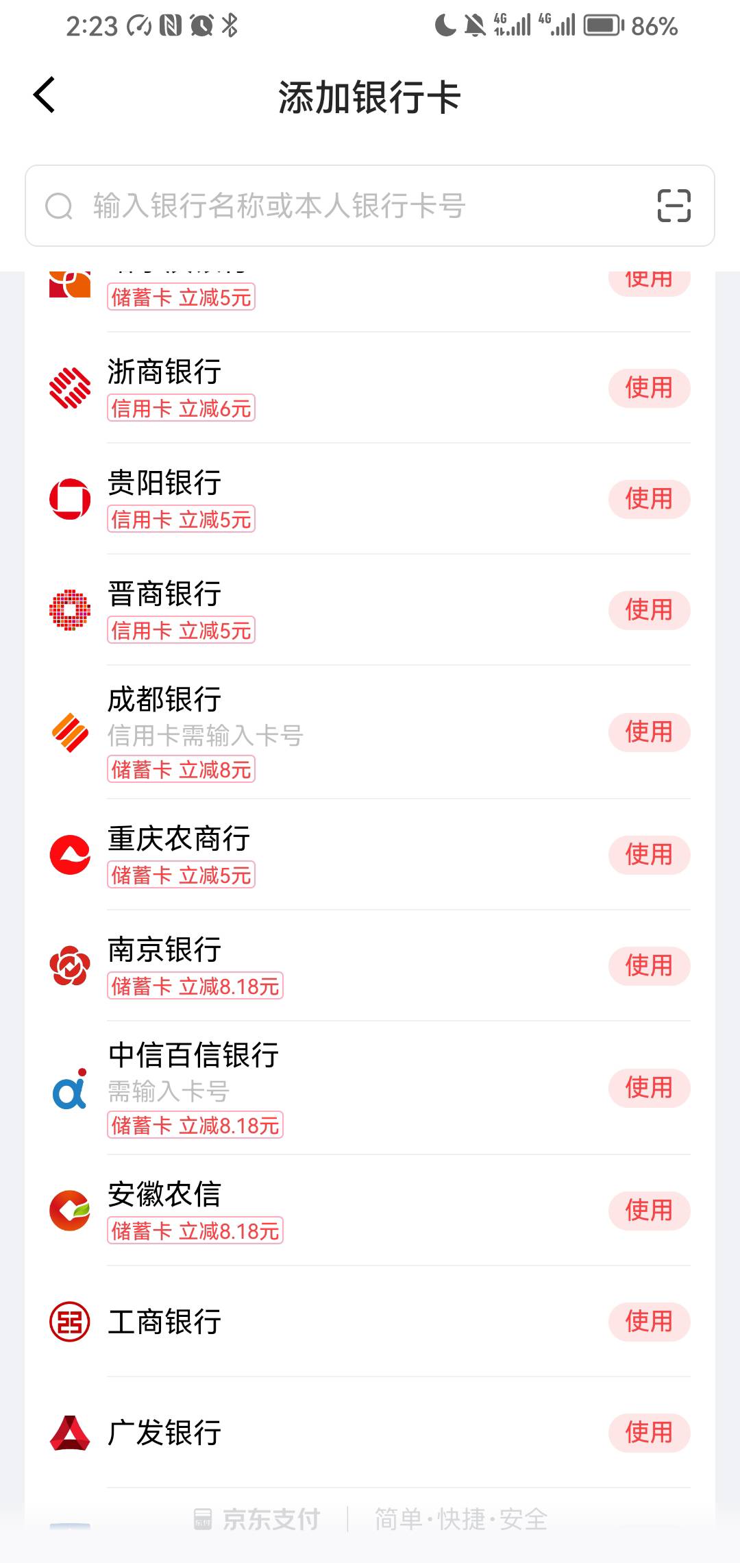 有个京东号绑中信,南京,安徽农信,浦发都是减8.18,这两天吃了4个免费外卖了