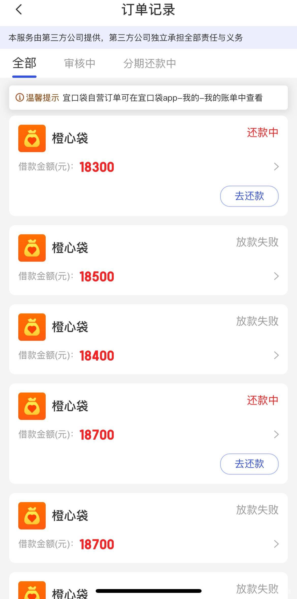 橙心袋第二笔到账,第一次是上个月30号下的,第二次一推是3号秒拒,二推7号,17号放款