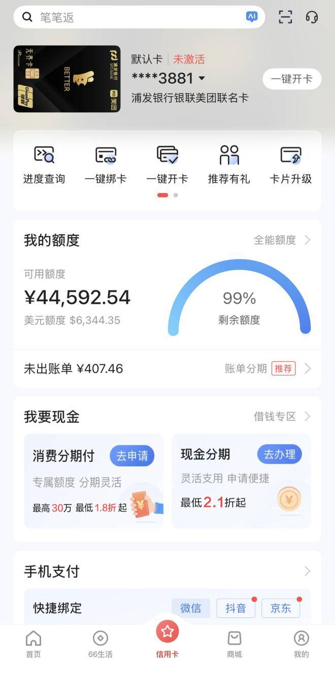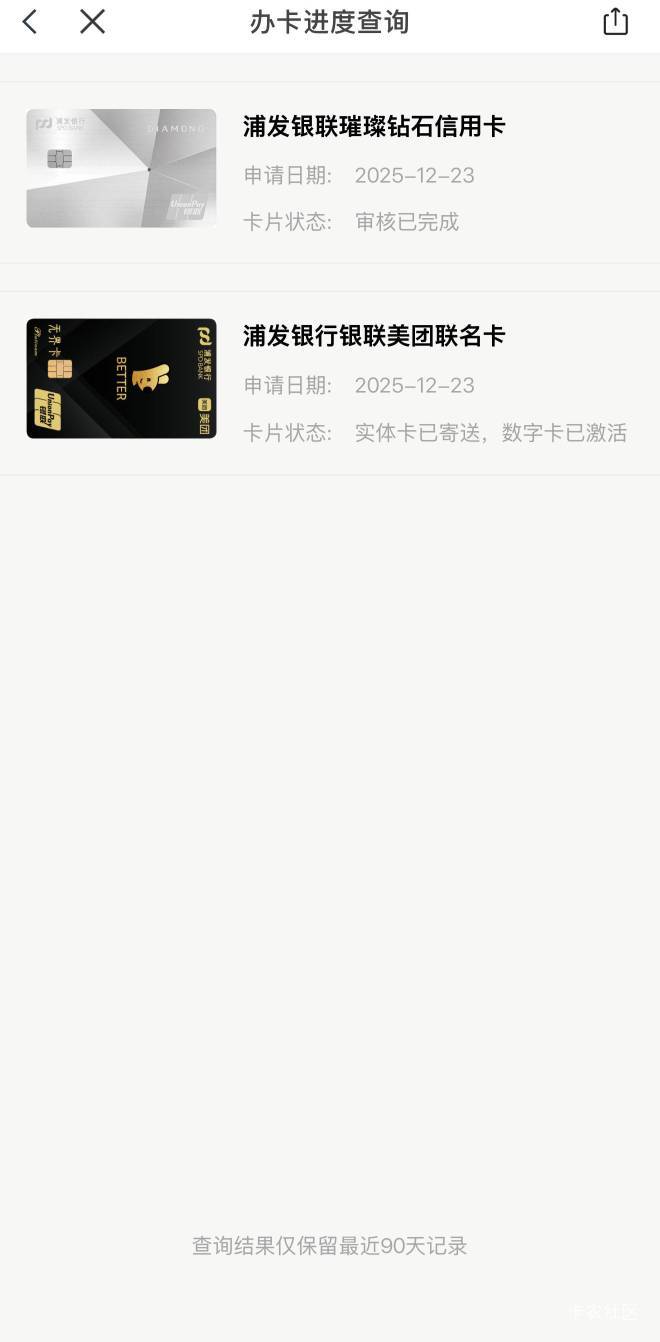 浦发银行曲线钻石成功,资质巨花,各种wd,每个月查询3次起,中行卡3k,招行总授信127k,江苏银行3k,使用率接近99%,抱着试一下的心态,半夜申请了浦发美团联名卡,早上就批了。
