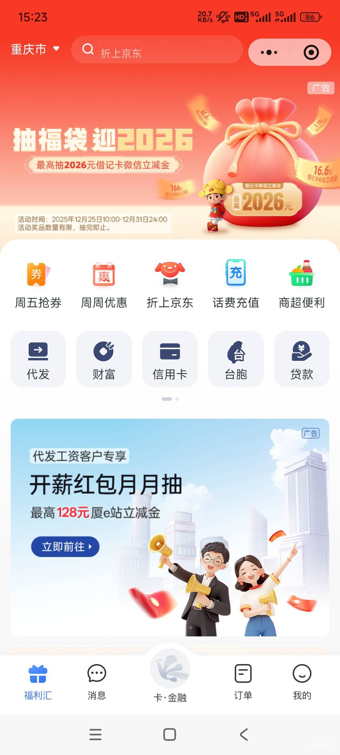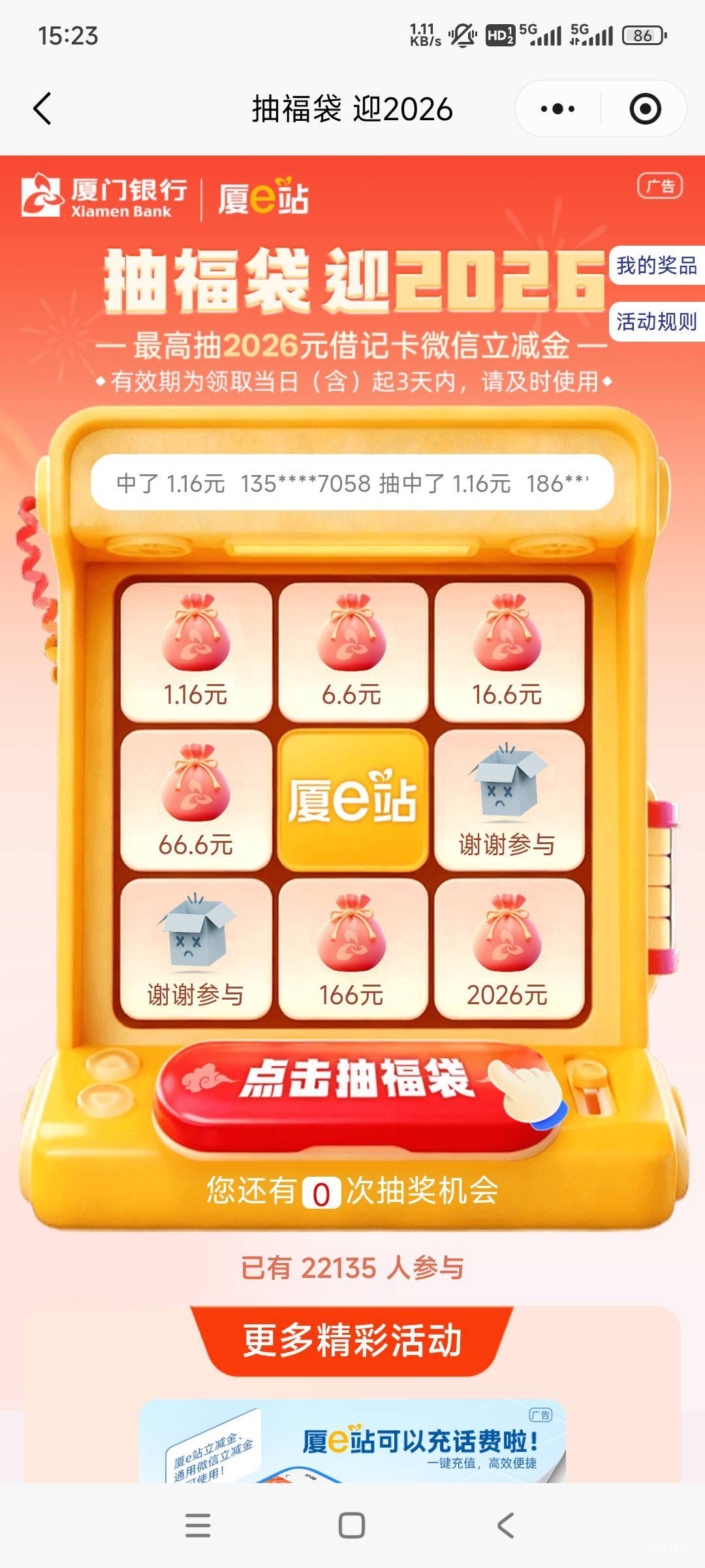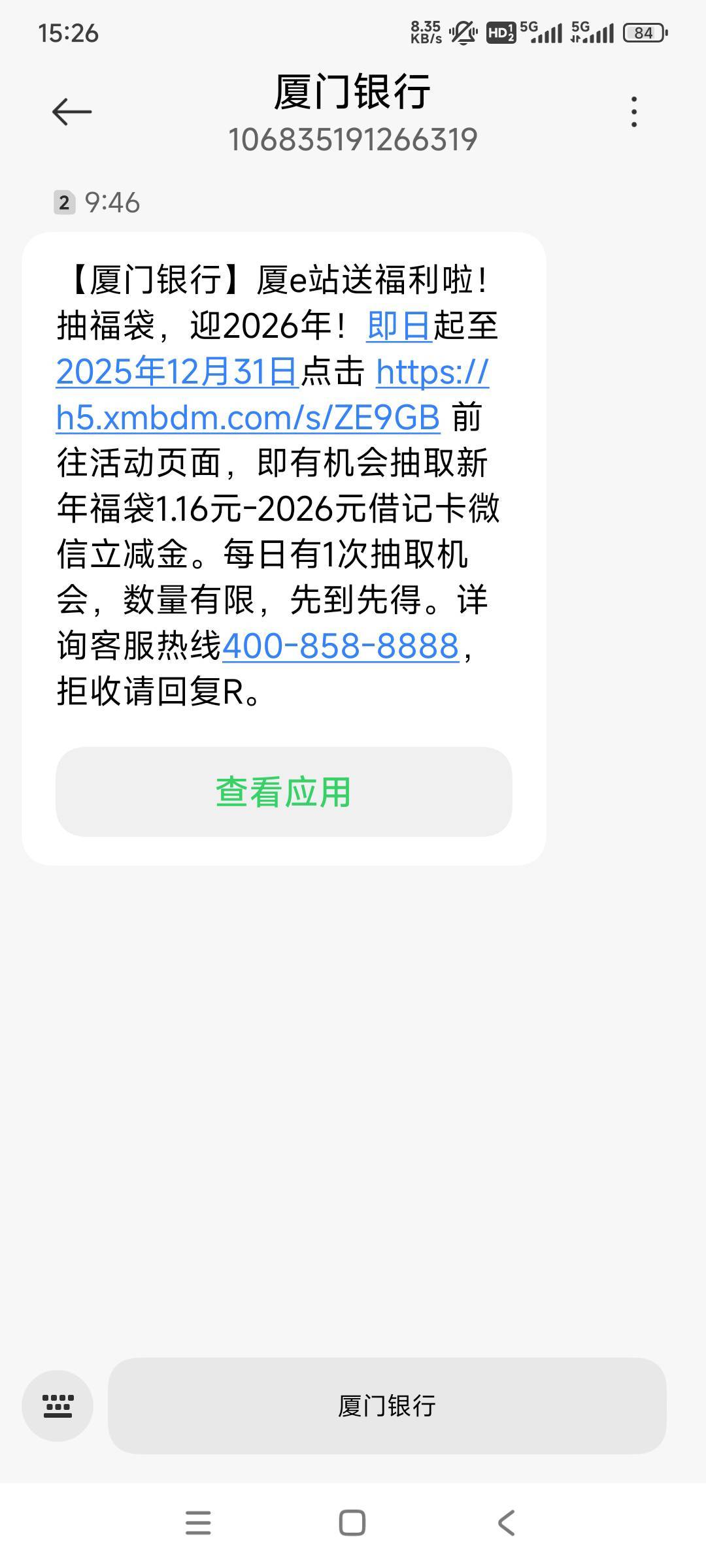 路径:打开厦门银行手机银行/最上面活动抽福袋迎2026/登录一下就直接抽取,给我发的短信