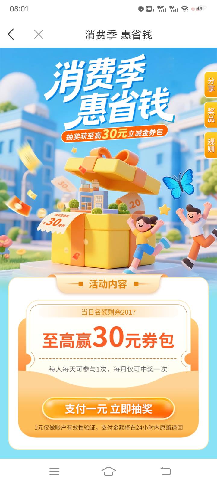 徽商银行惠省钱,支付一元抽