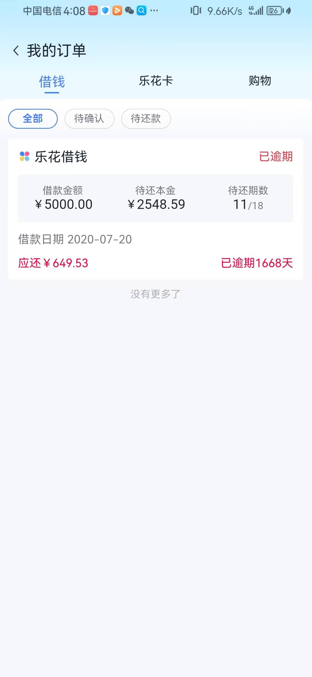 分期乐逾期1668天,没还,但征信显示已结清,而且逾期记录也没了。今天发现还有2000额