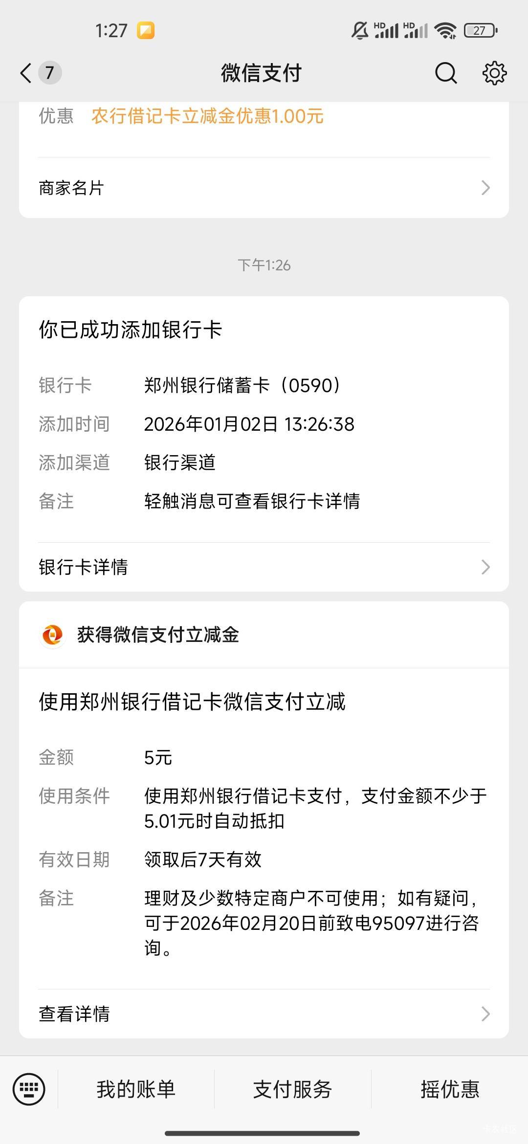 郑州银行绑卡微信5元微信立减金活动