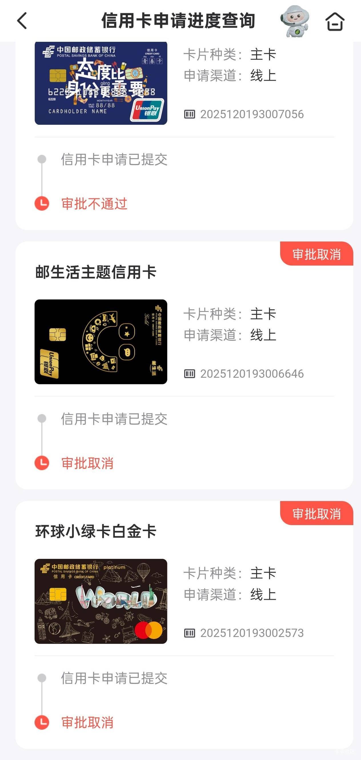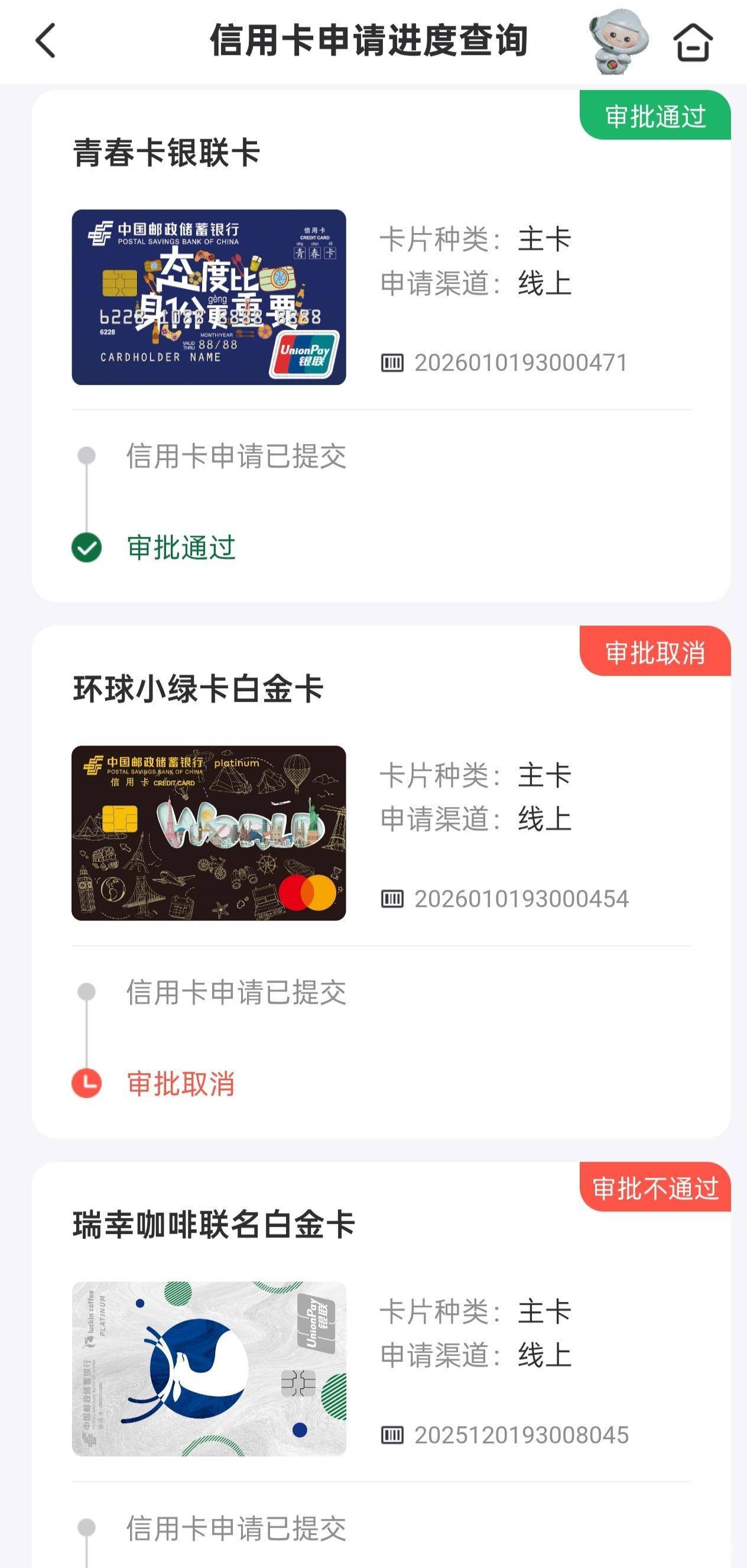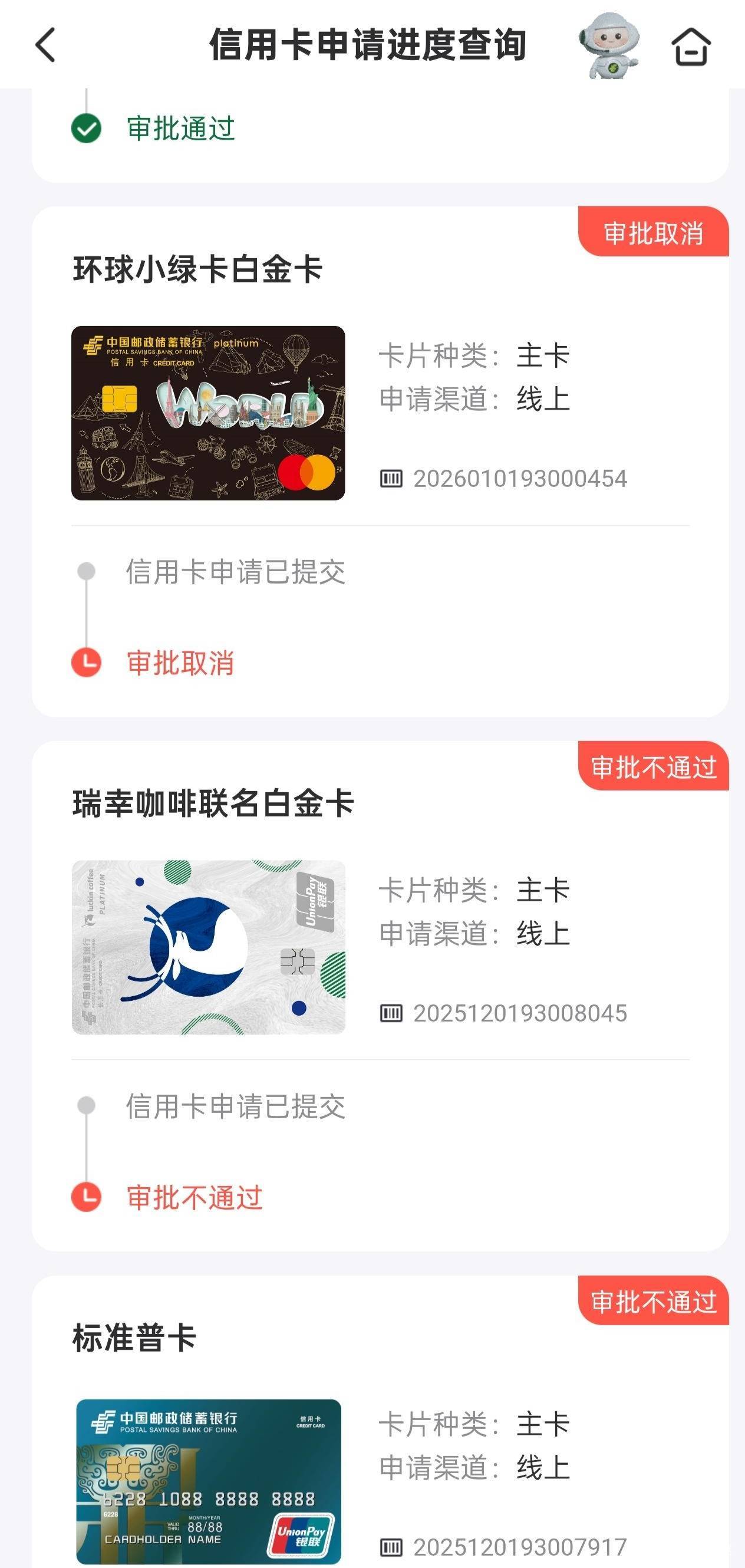 邮储银行下卡了,上个月申请隔了一天接到电话,问了工作信息,挂完电话审批取消,后面