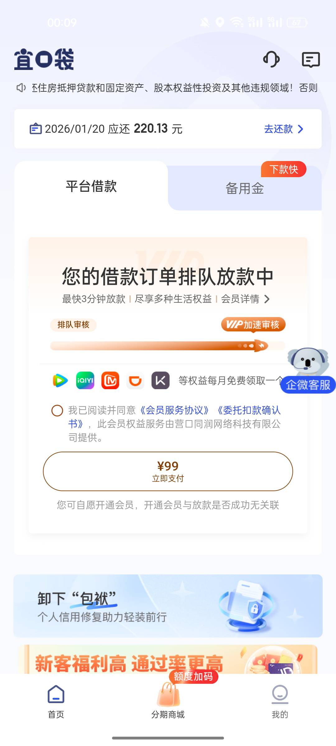 宜口袋本体借款,这个开会员有用吗?之前都是提交后不出几秒就拒了,这次坚挺了10几分钟了还没拒,提示开99会员,这个开了能下吗