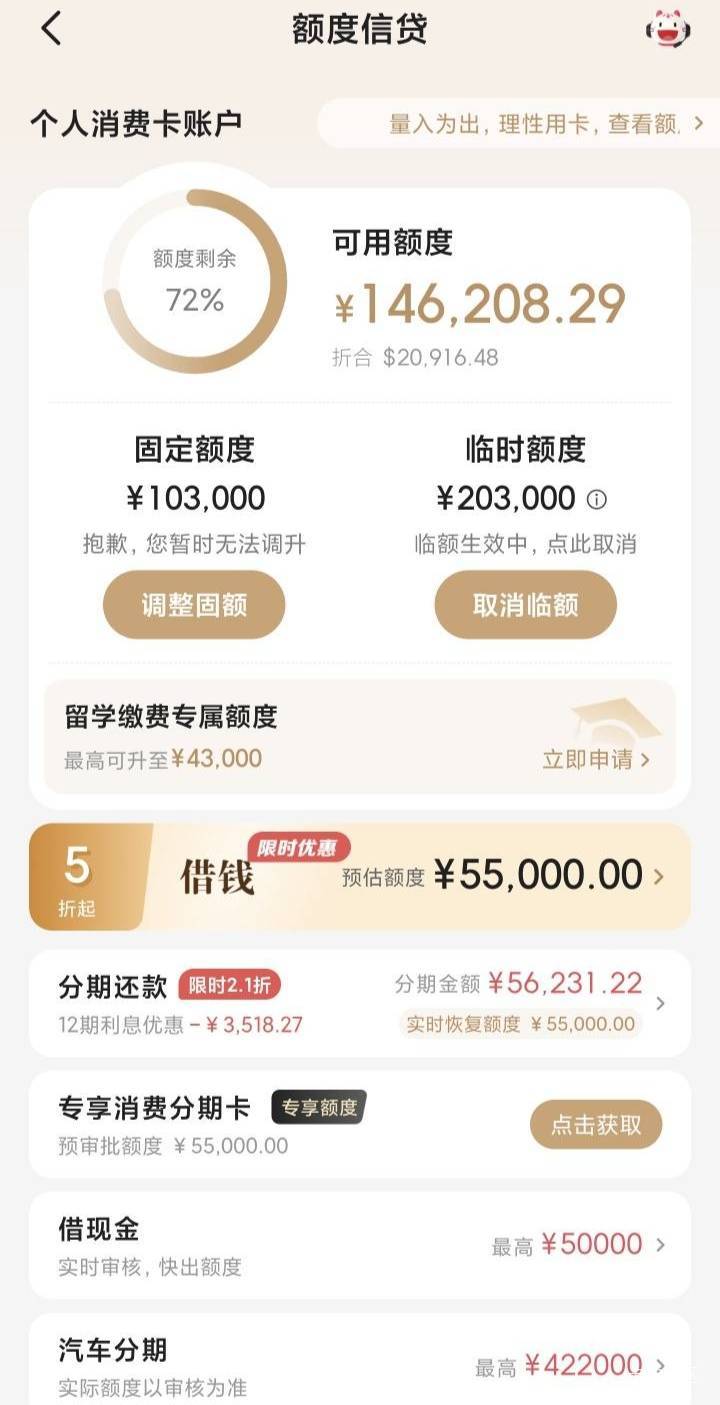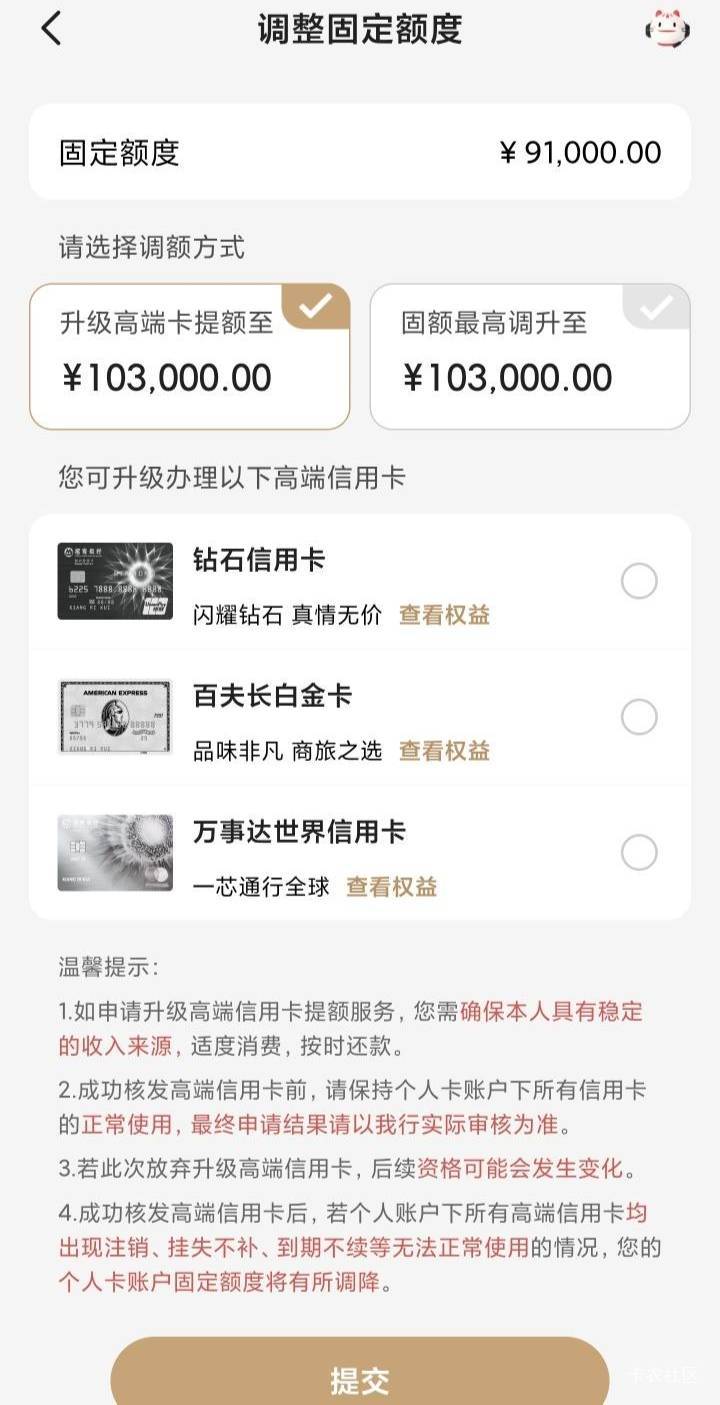 招商银行刚打开APP,发现可以提升额度了,距上次四个半月再次提升额度,不过这次可以升高端卡,放弃,没钱交年费,直接点了提固额,固额临额均已提升。