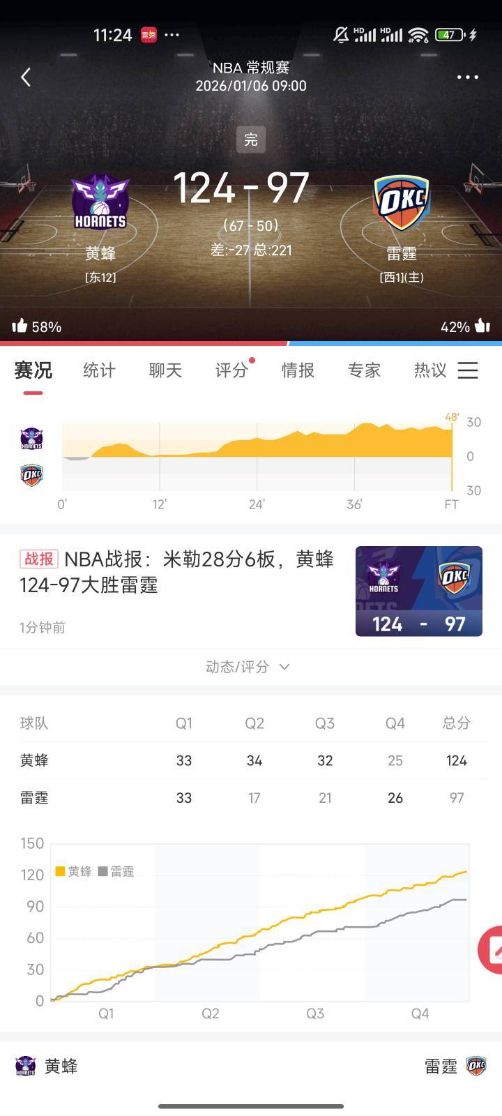 流水闲人 发表于 2026-01-06 11:28 雷霆这剧本谁能想到啊,之前还在幻想74胜,首败输的西部弱队开拓者,然后被马刺连打三个大嘴巴子三杀,昨天又双叒叕被太阳大逆转,今天回到主场直接不装了,惨败联盟万年摆烂队黄蜂