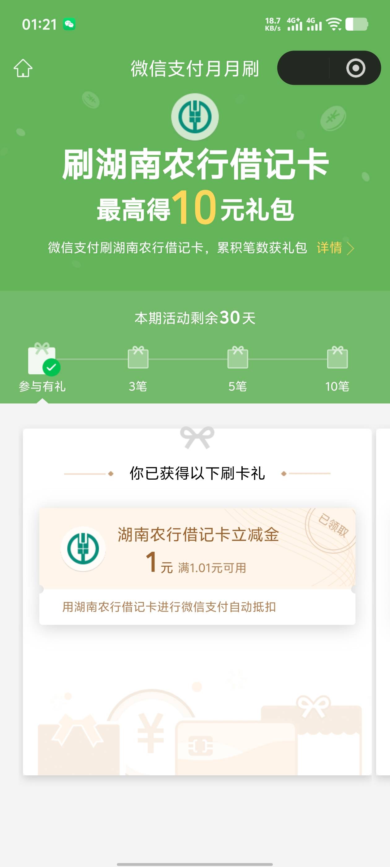 农行湖南微信支付月月刷活动