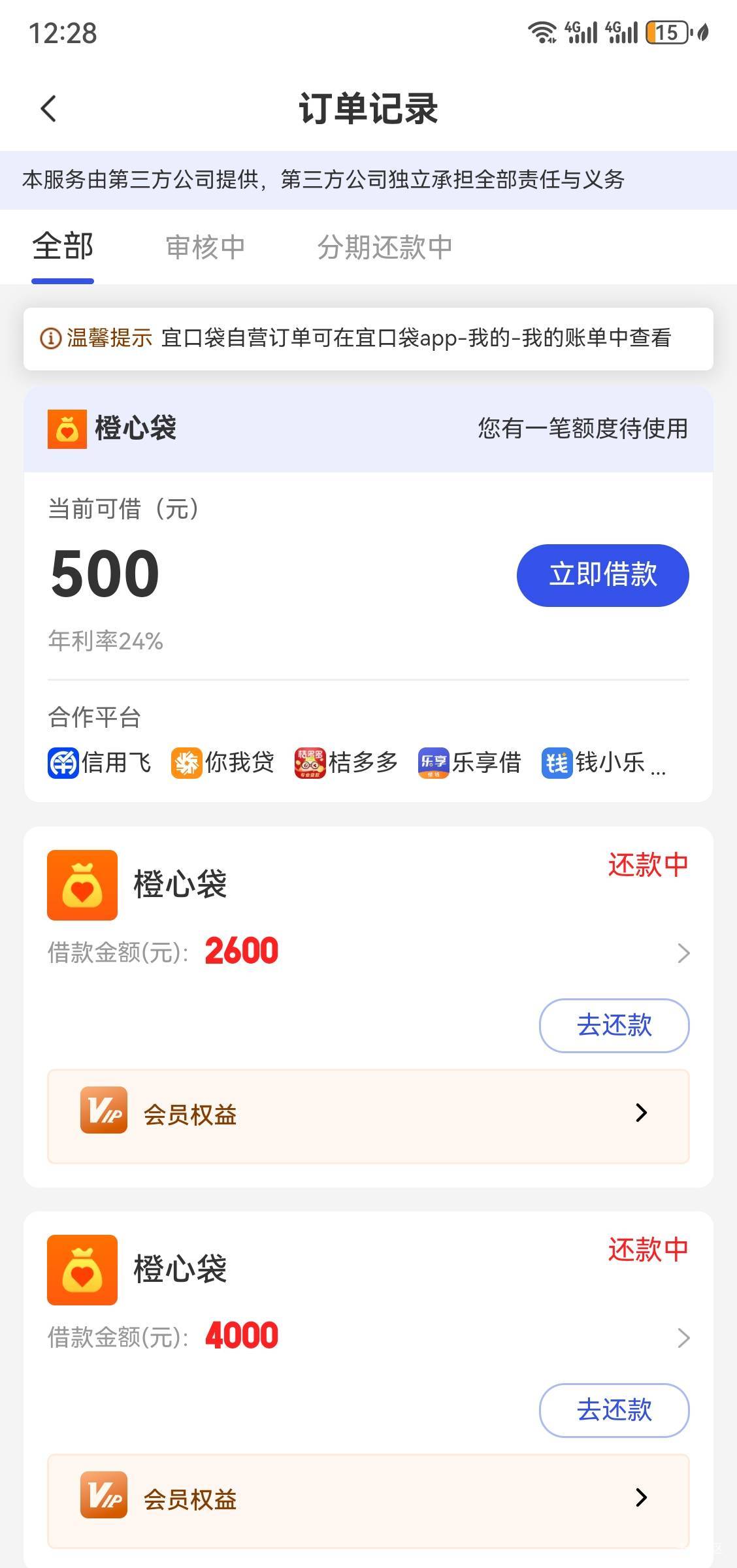 橙心袋还真是像老哥说的,用来给宜口袋平账的,我没逾期。宜口袋明天有一笔300到期,今天给了500专项资金。点了借款开了会员秒到。扣了39会员,还扣个300我还纳闷,今天也没有还款啊,一顿查,明天到期的宜口袋300直接扣掉了。