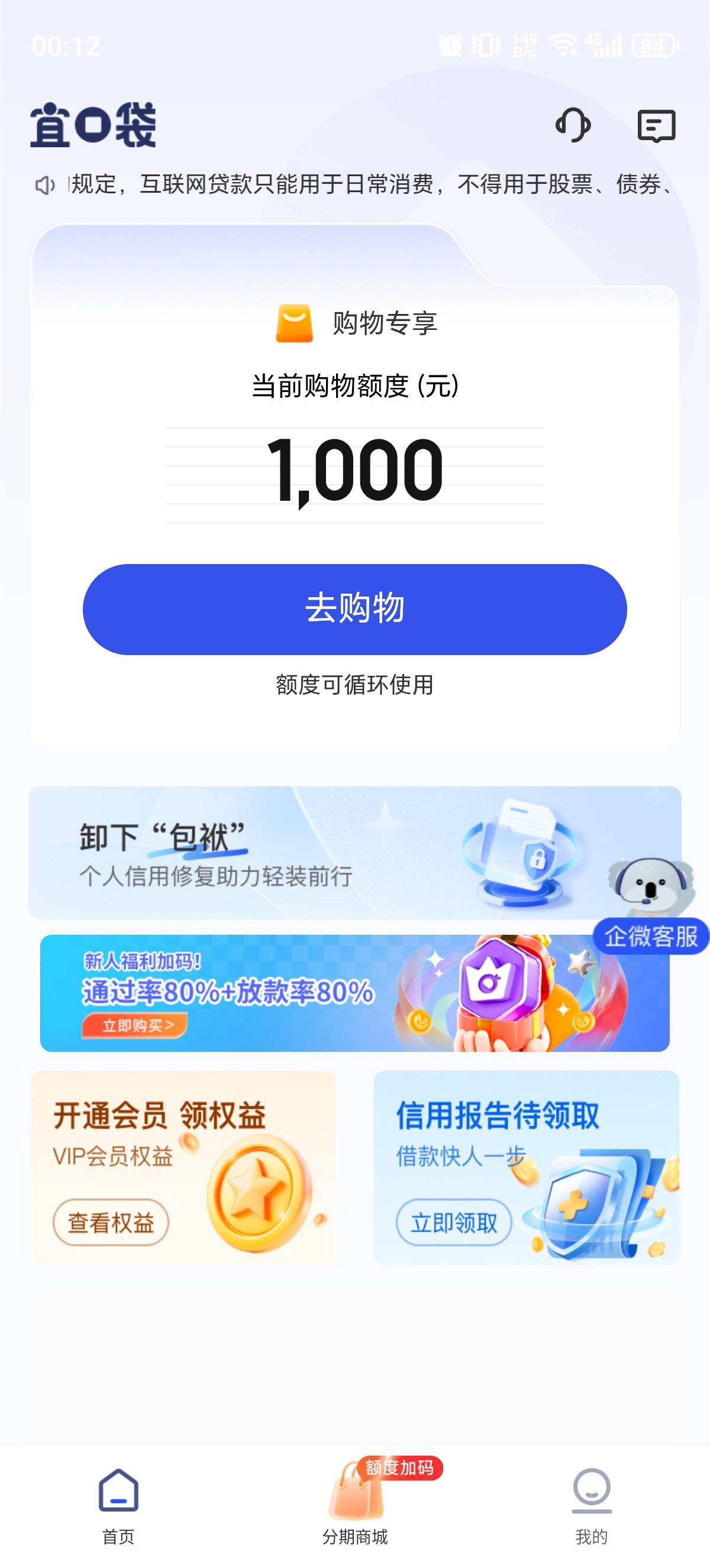 我也是只有购物额度,借款额度有1000,就是只能看看,没有入口