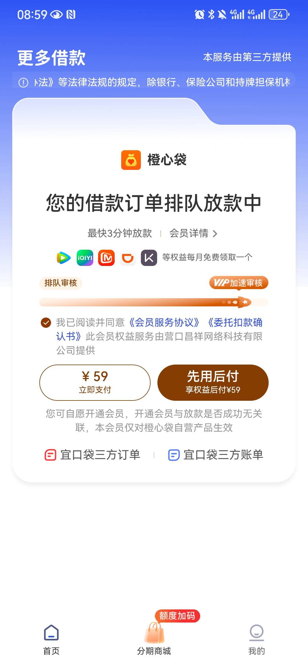 老哥们 橙心贷不开能下吗?开了能不能退啊?才七八百就要59会员